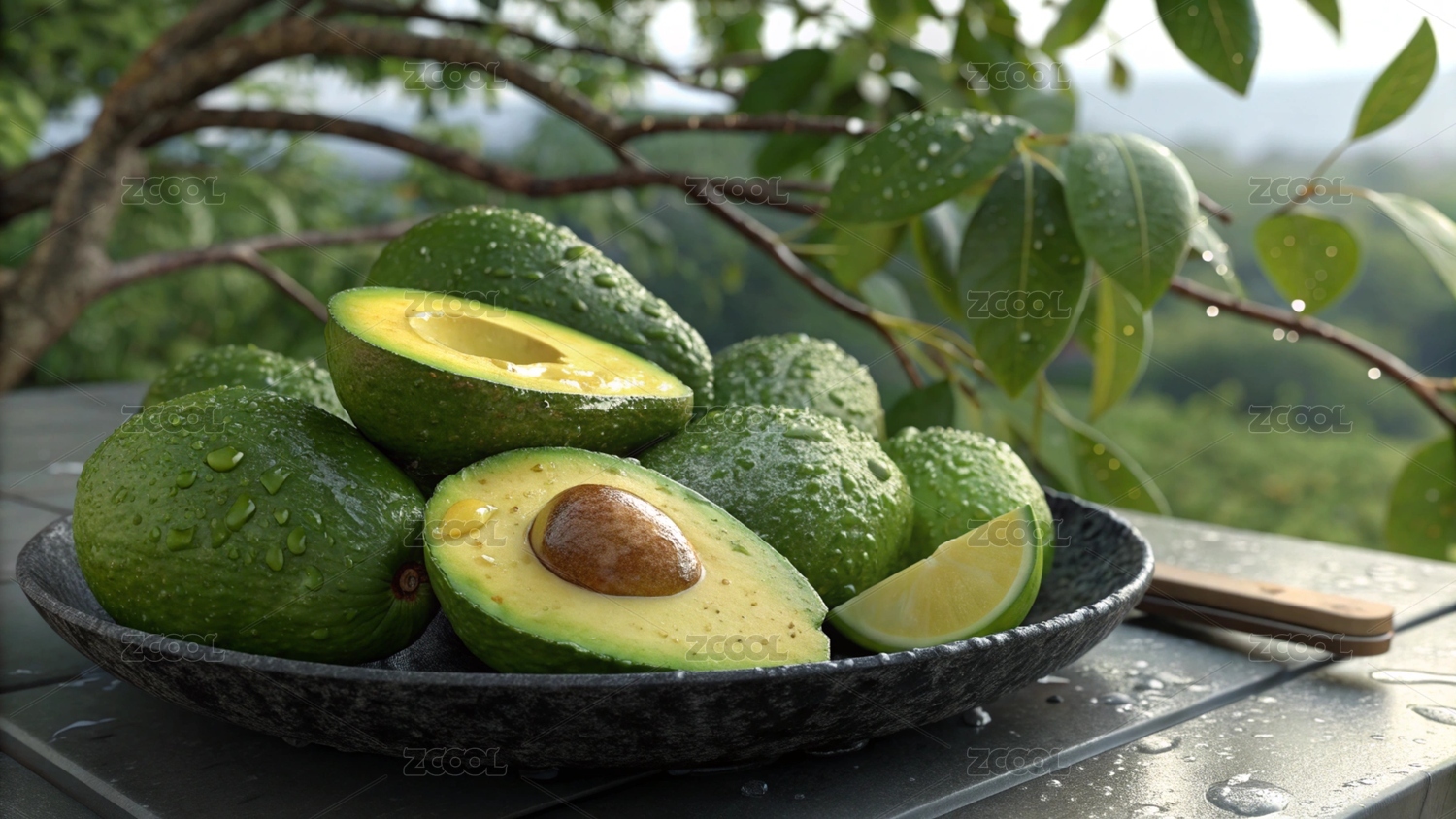 牛油果,水果,切开的牛油果,盘子里的牛油果,绿叶,户外场景,水珠,摆盘,切片,果肉