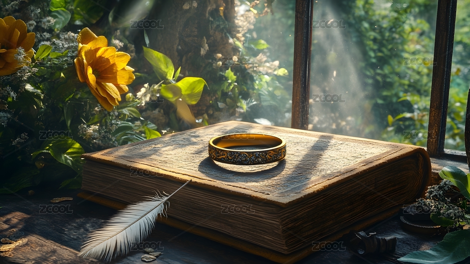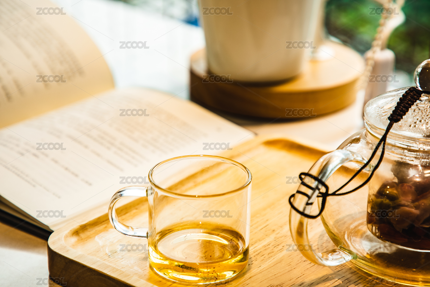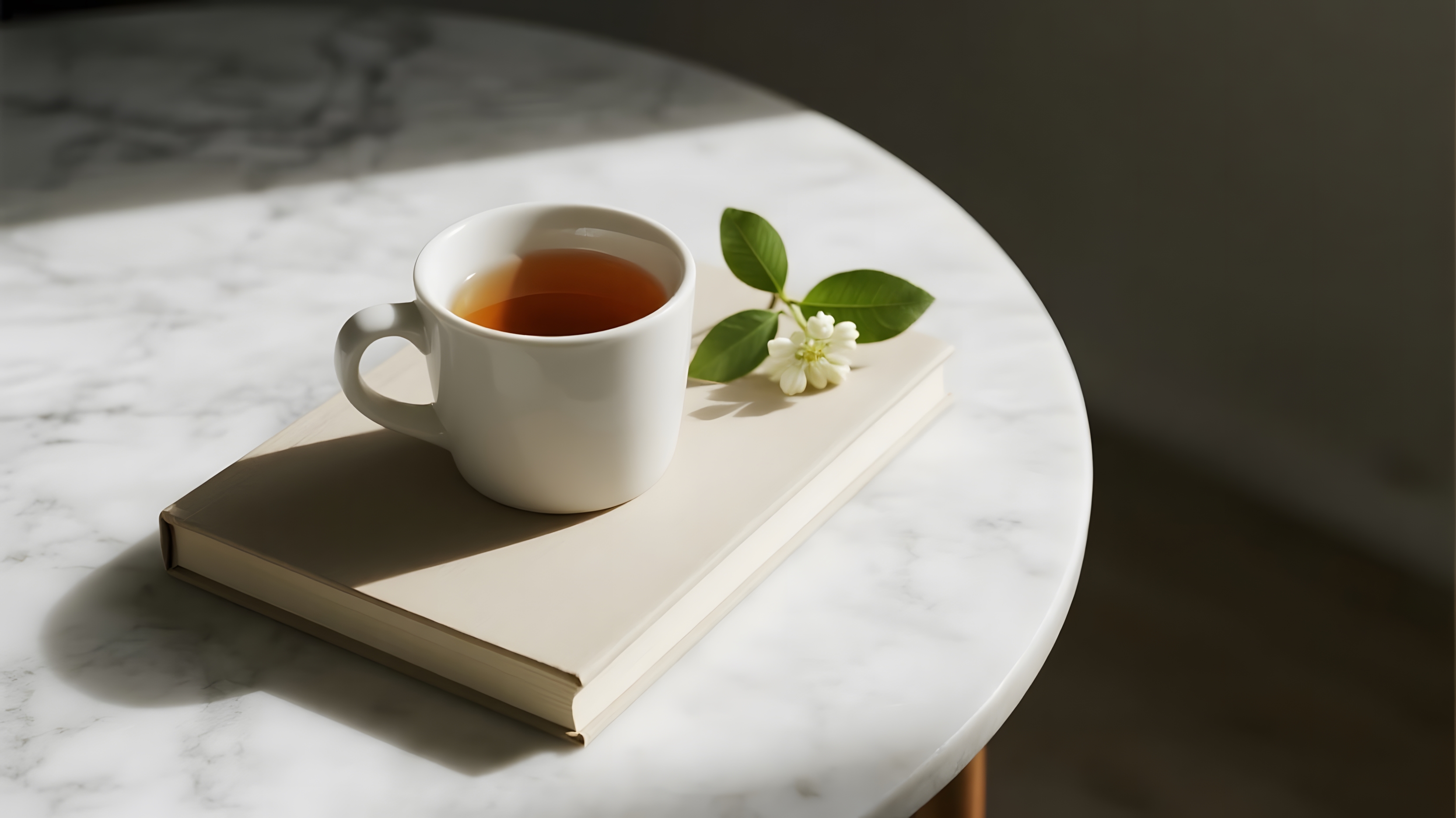 窗边大理石桌上放着一本翻开的书和一壶花茶