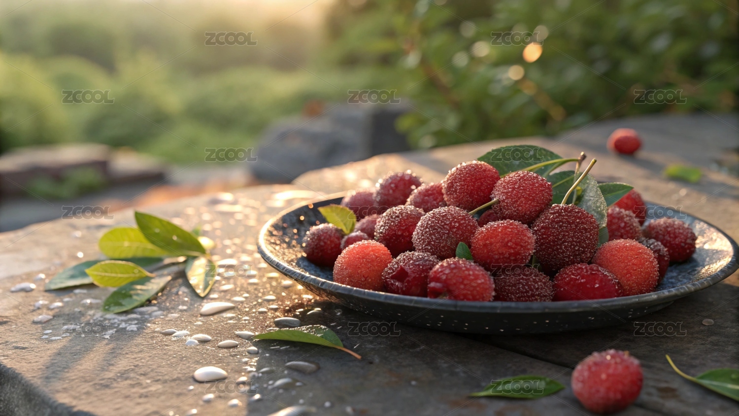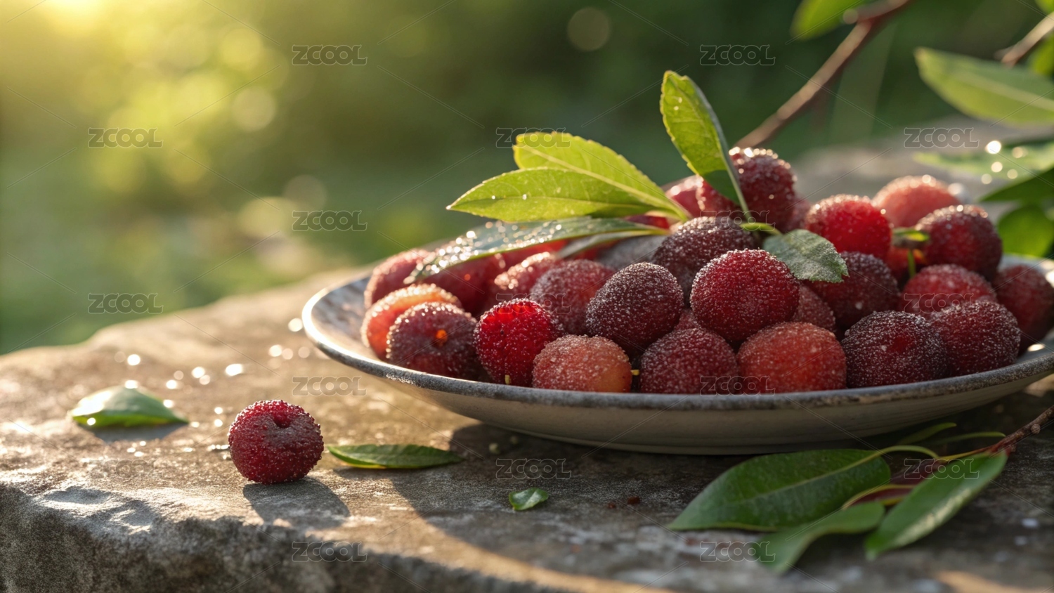 杨梅,fruit,水果,盘装水果,绿叶,户外,自然光线,水珠,鲜果,红果