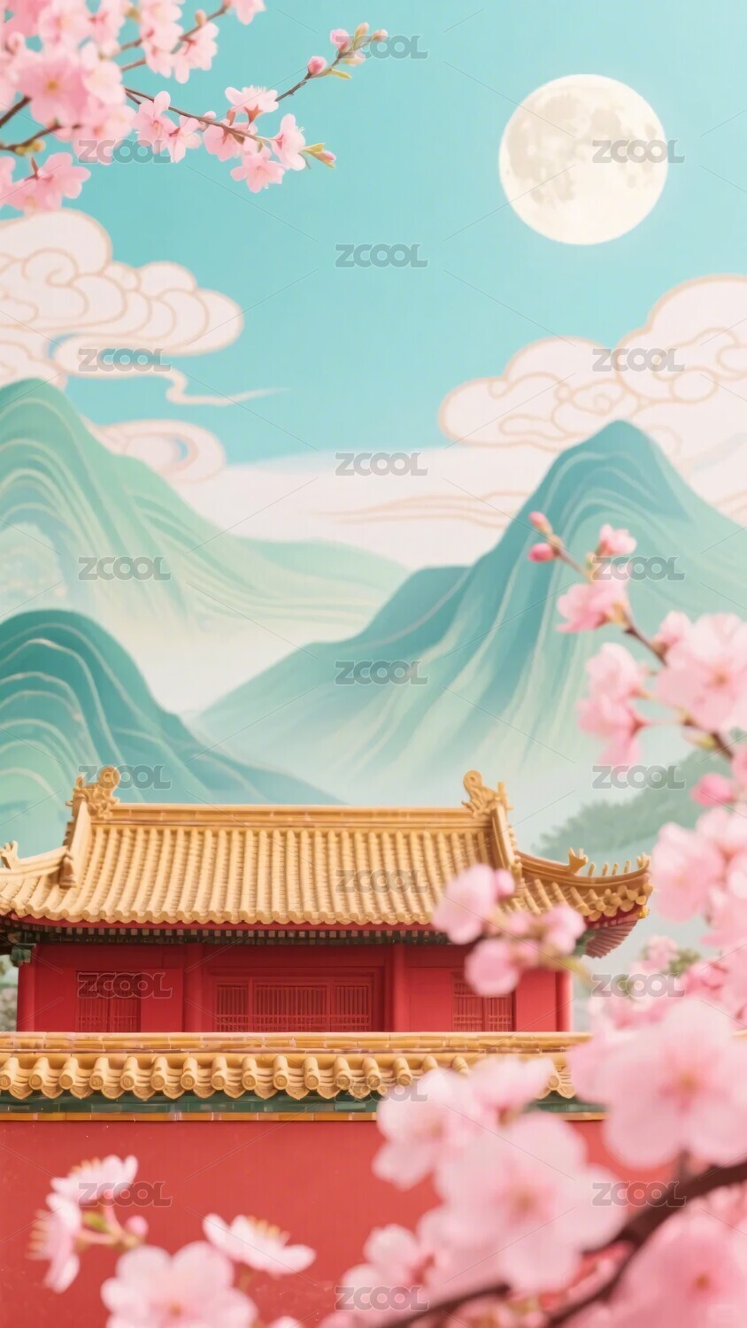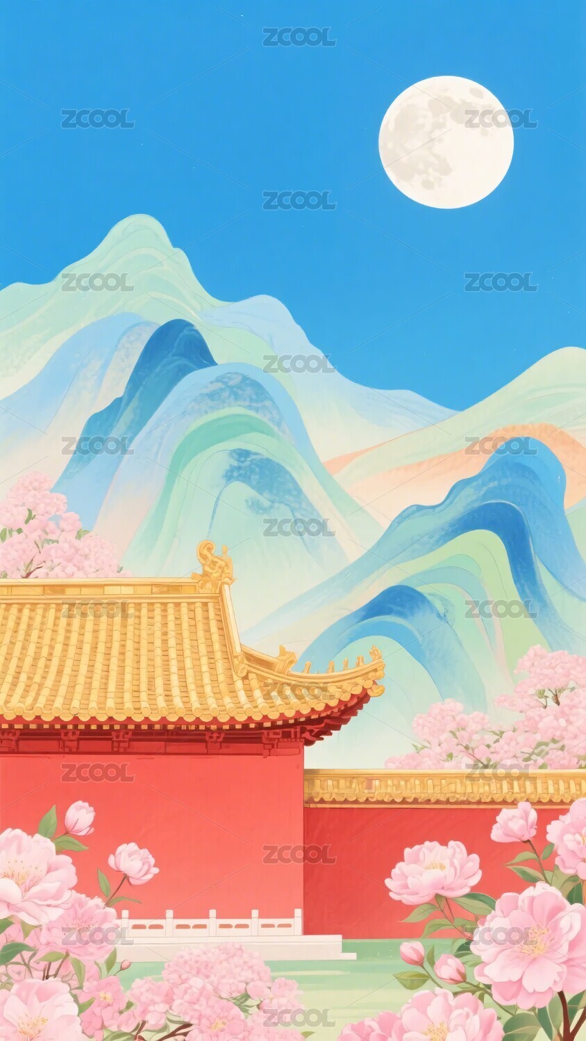 宫殿,月亮,繁花,古风,插画,景色,建筑,背景,中式,唯美