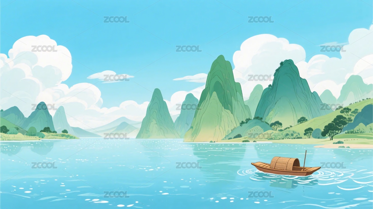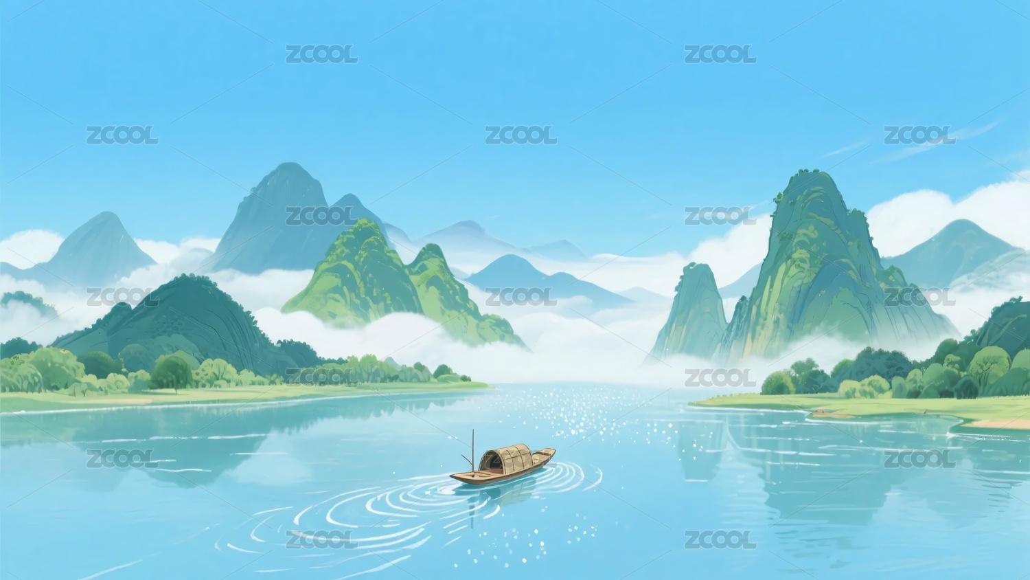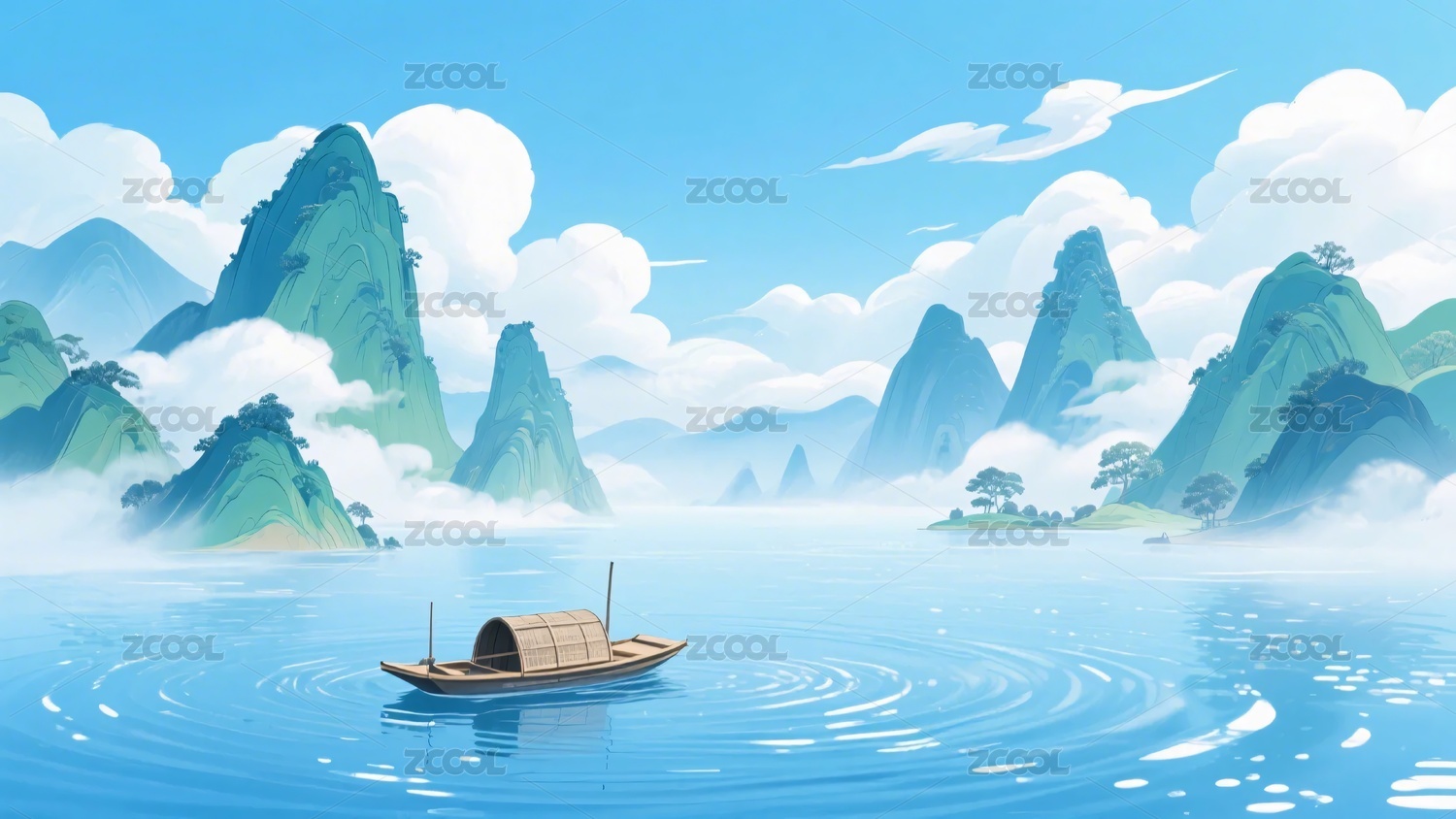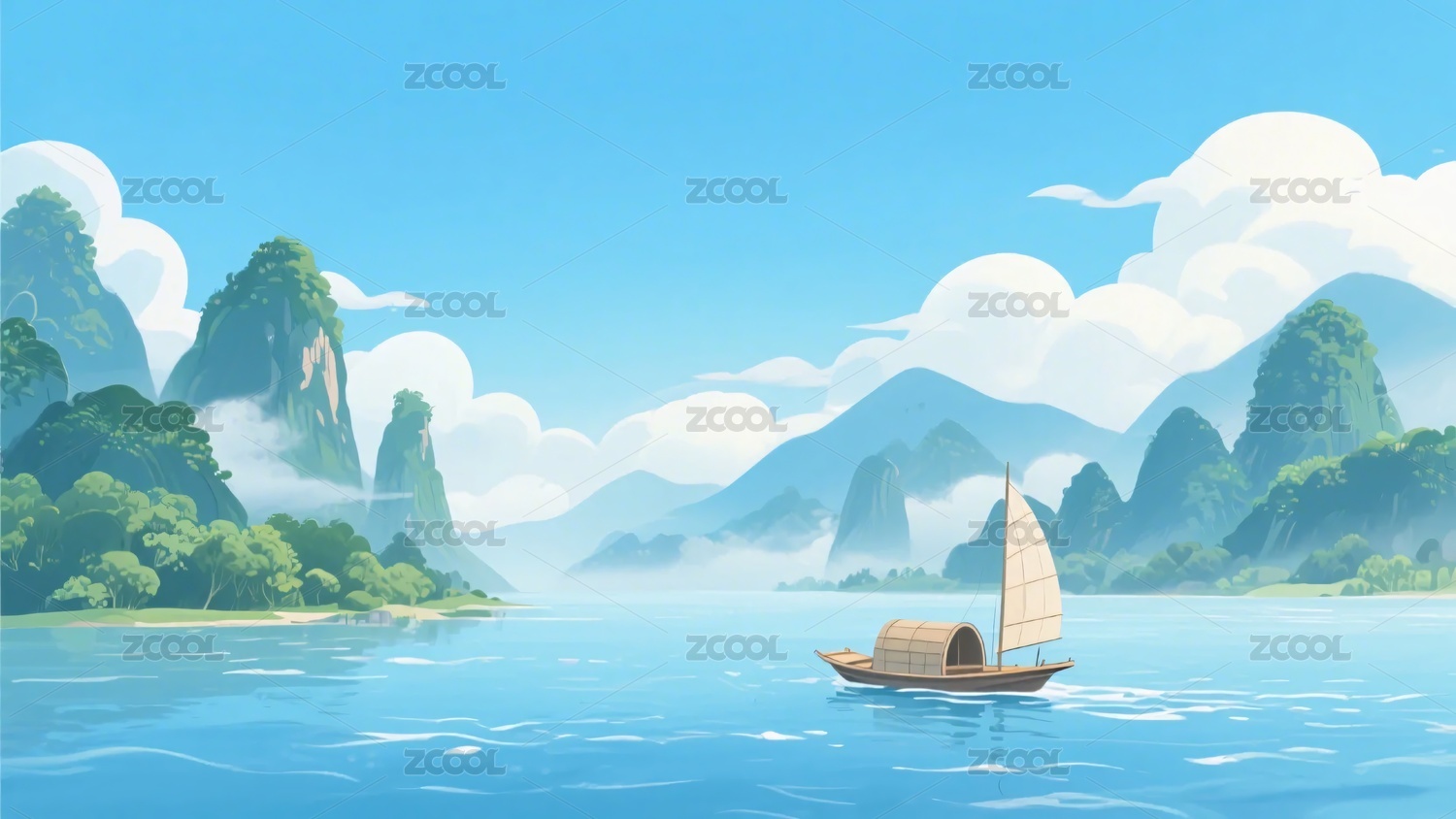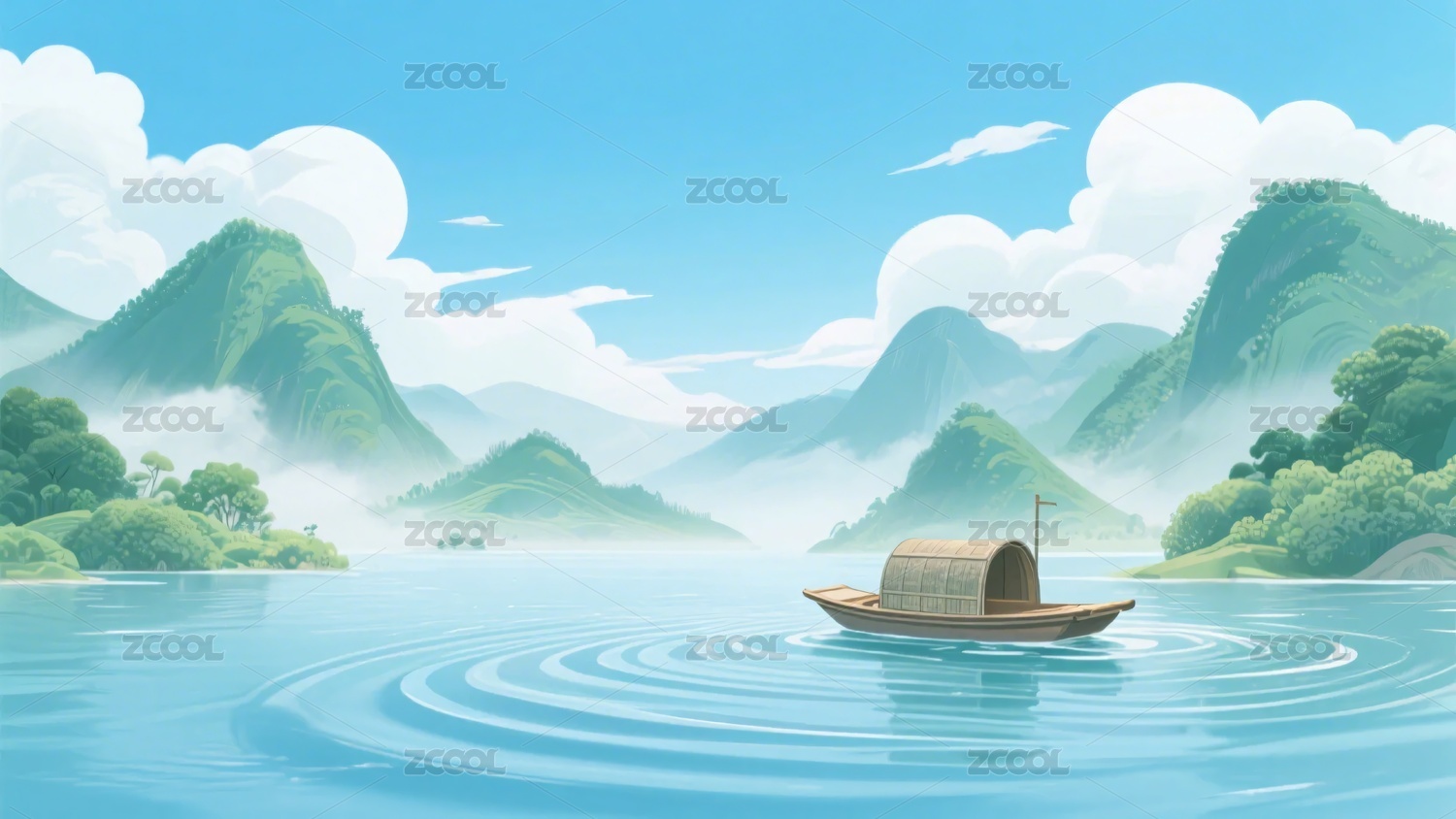 山水,孤舟,插画,风景,小船,远山,白云,水面,波纹,自然