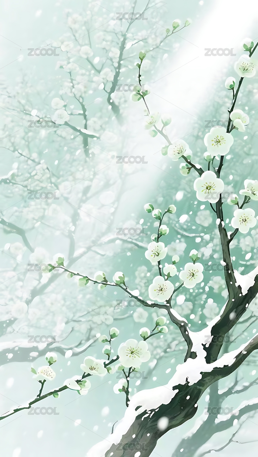 雪落梅枝冬景