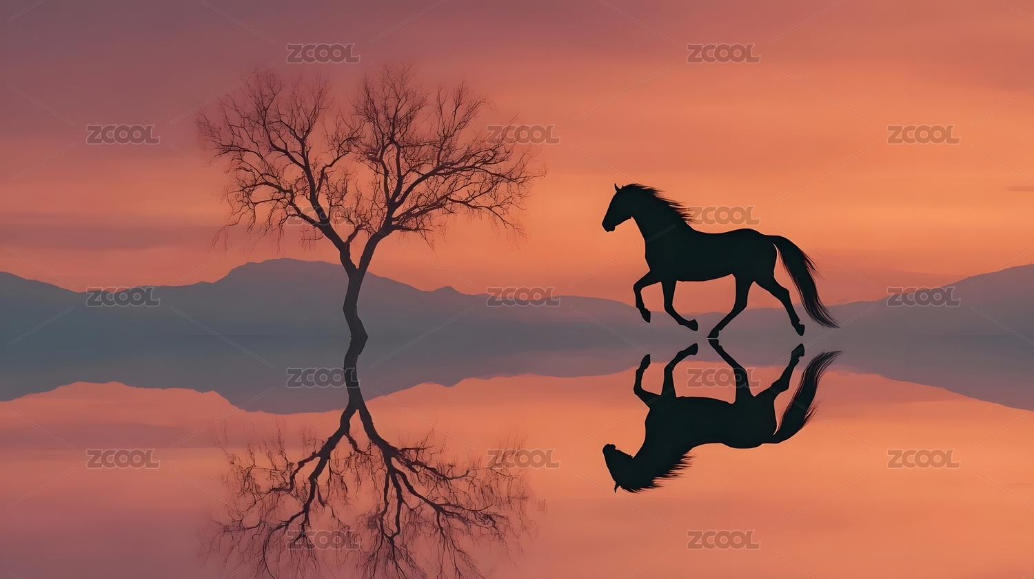 红霞下孤树与兽