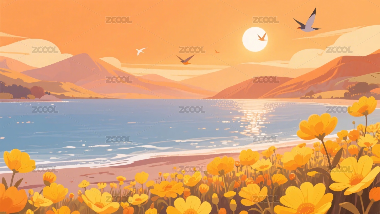 海边,日落,花丛,飞鸟,插画,风景,自然,唯美,浪漫,宁静