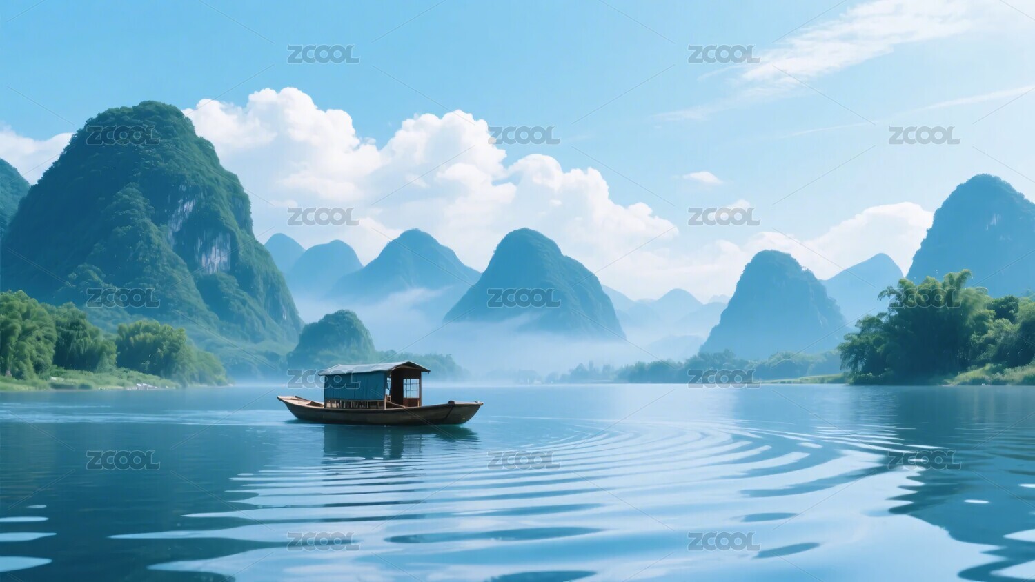 山水,孤舟,云雾,自然,风景,插画,美景,宁静,清新,淡雅