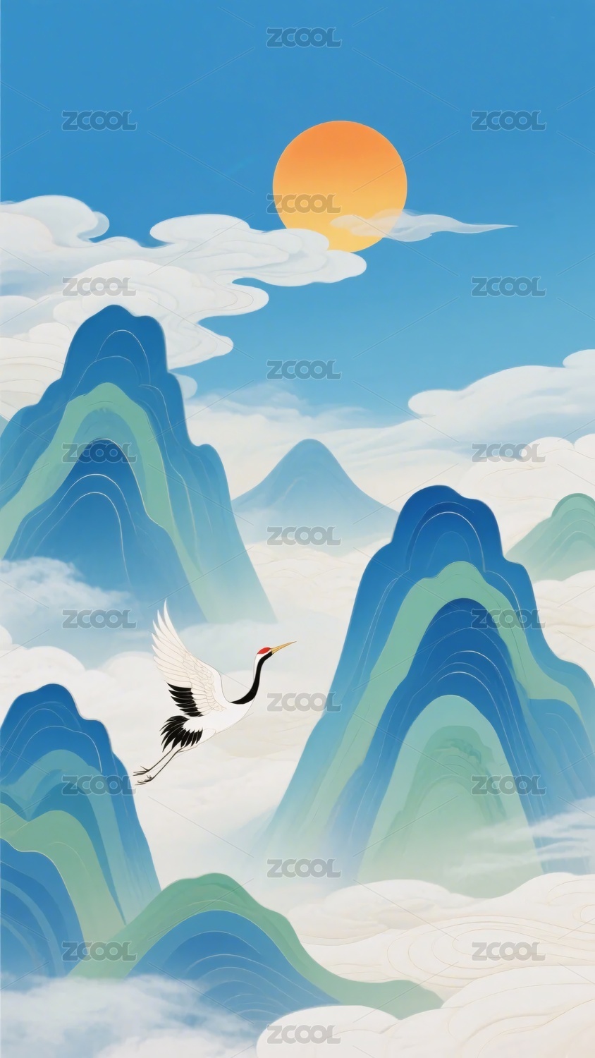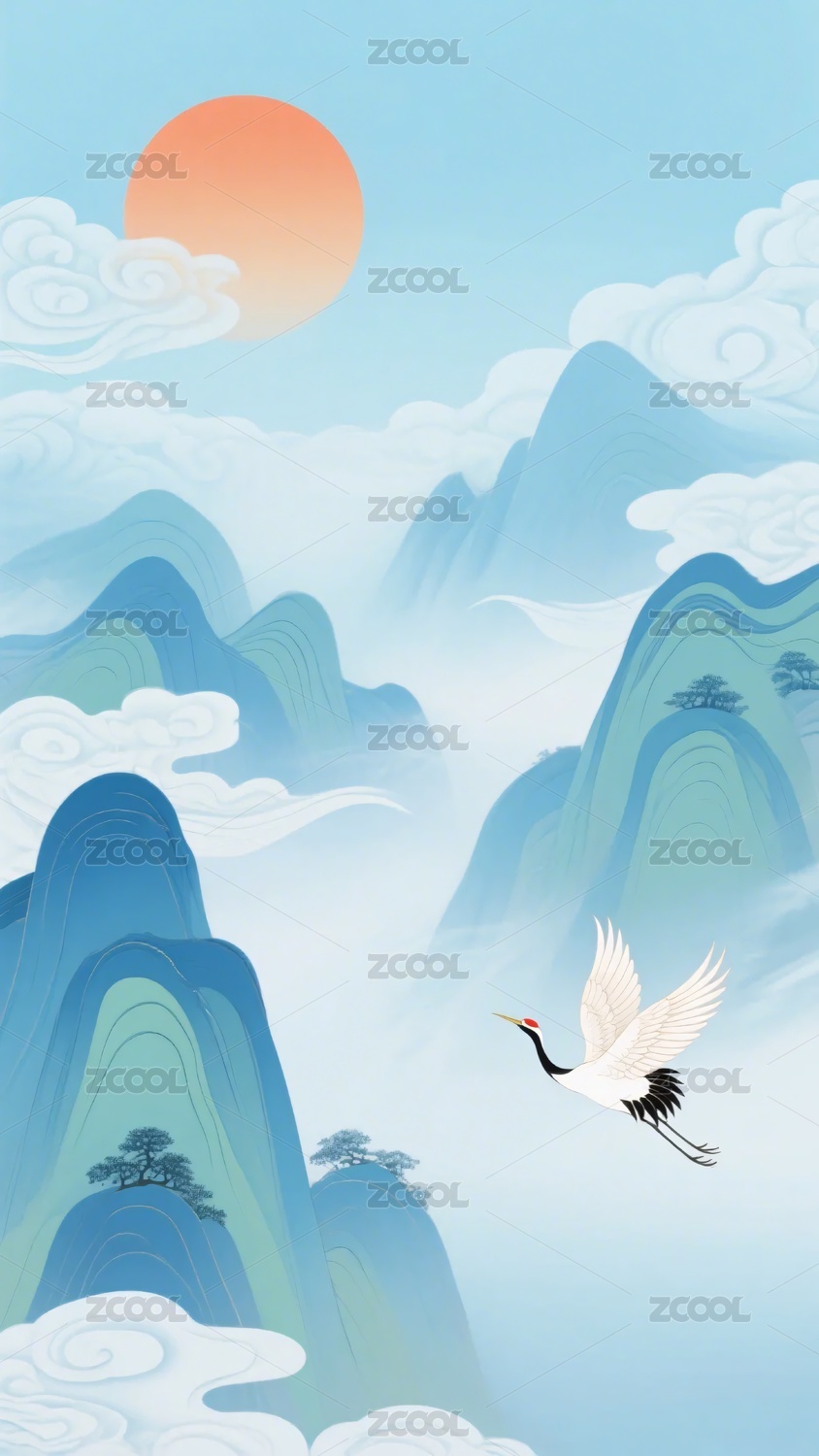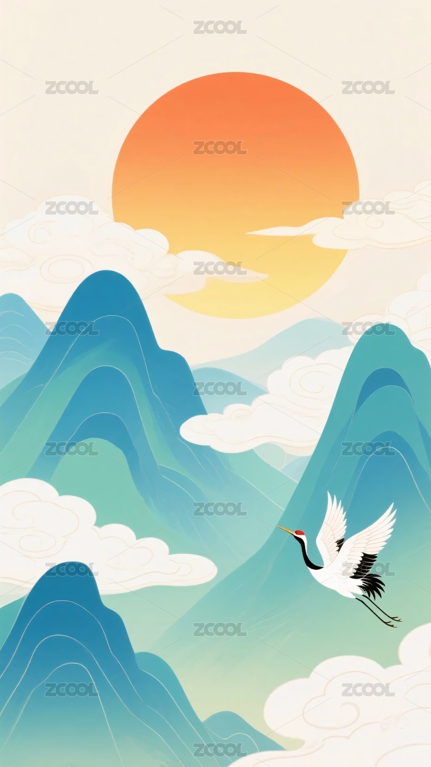 仙鹤,山峰,太阳,云朵,插画,风景,自然,中式,意境,唯美