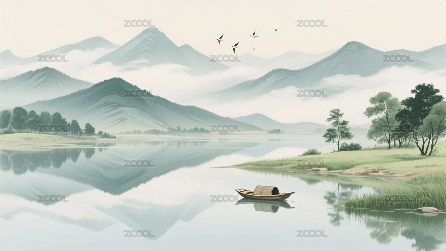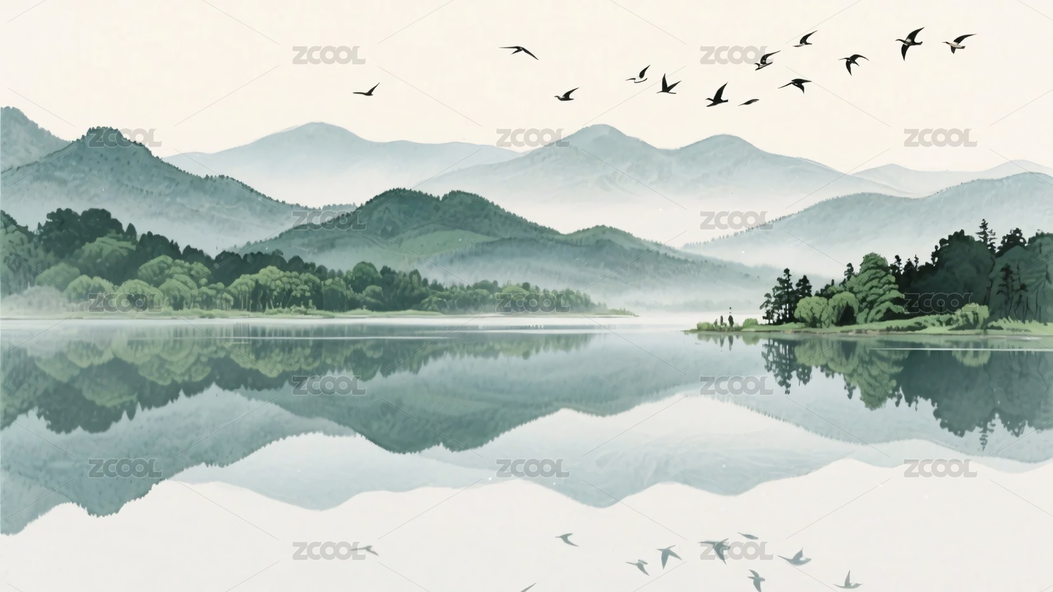 山水,河流,树木,飞鸟,自然,风景,插画,中式,清新,淡雅
