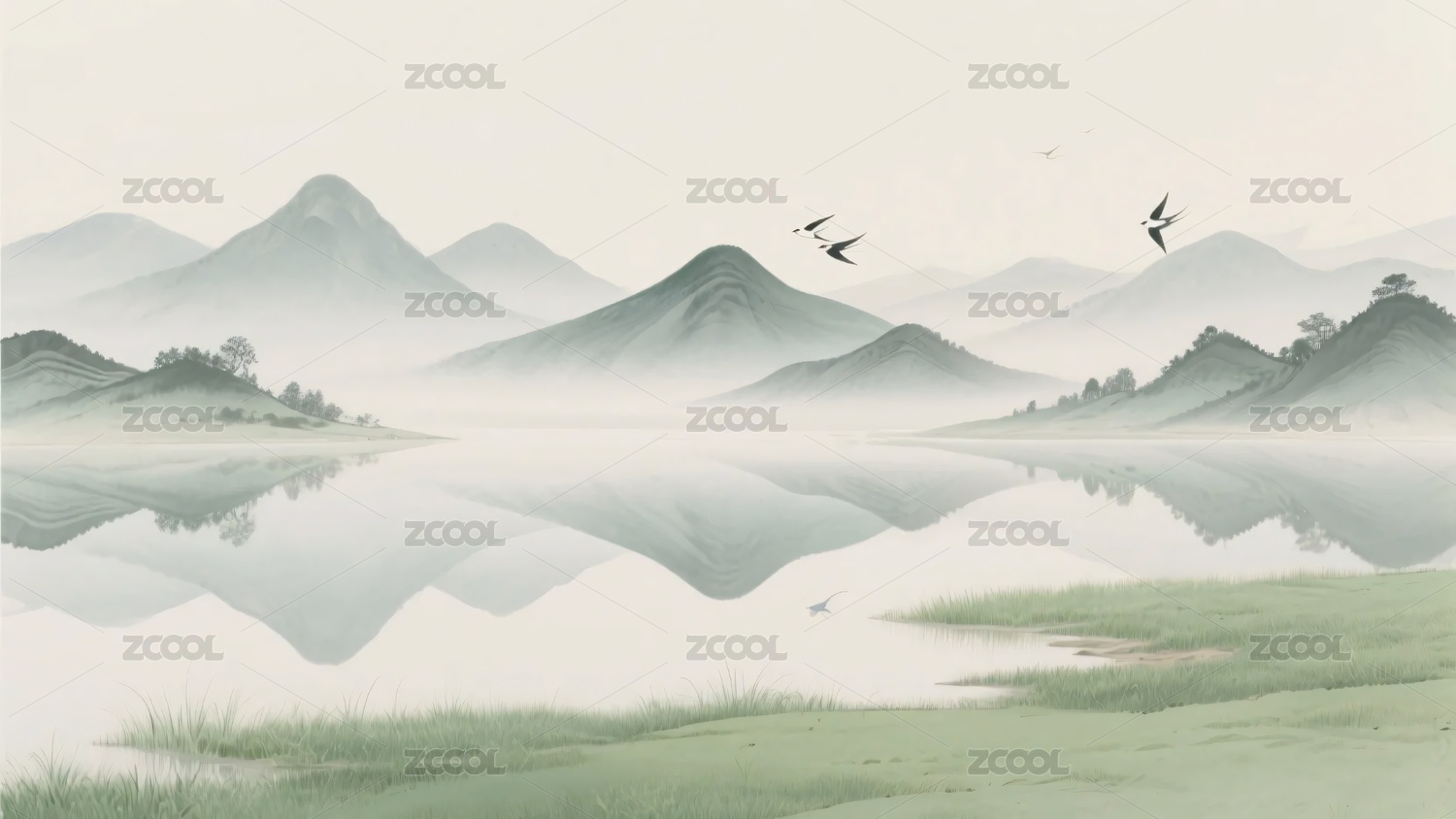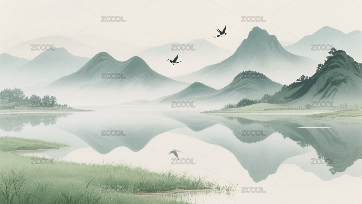 水墨风山水荷塘飞鸟图景