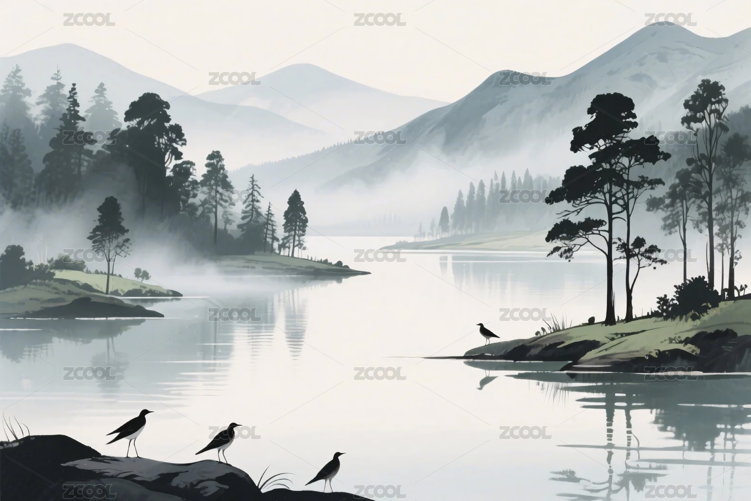 水墨风山水飞鸟自然图景