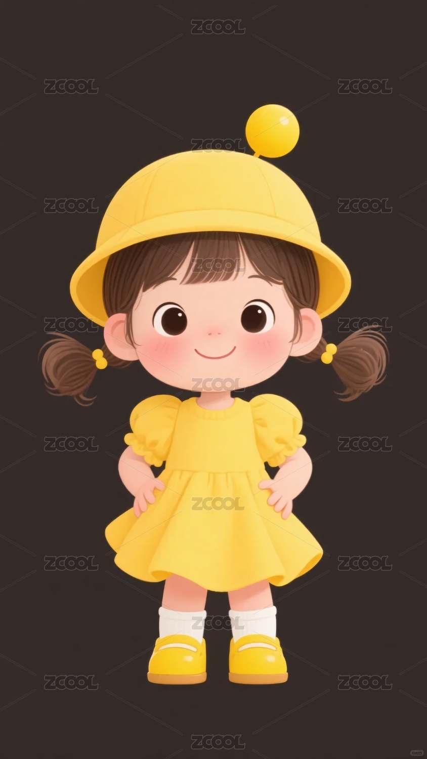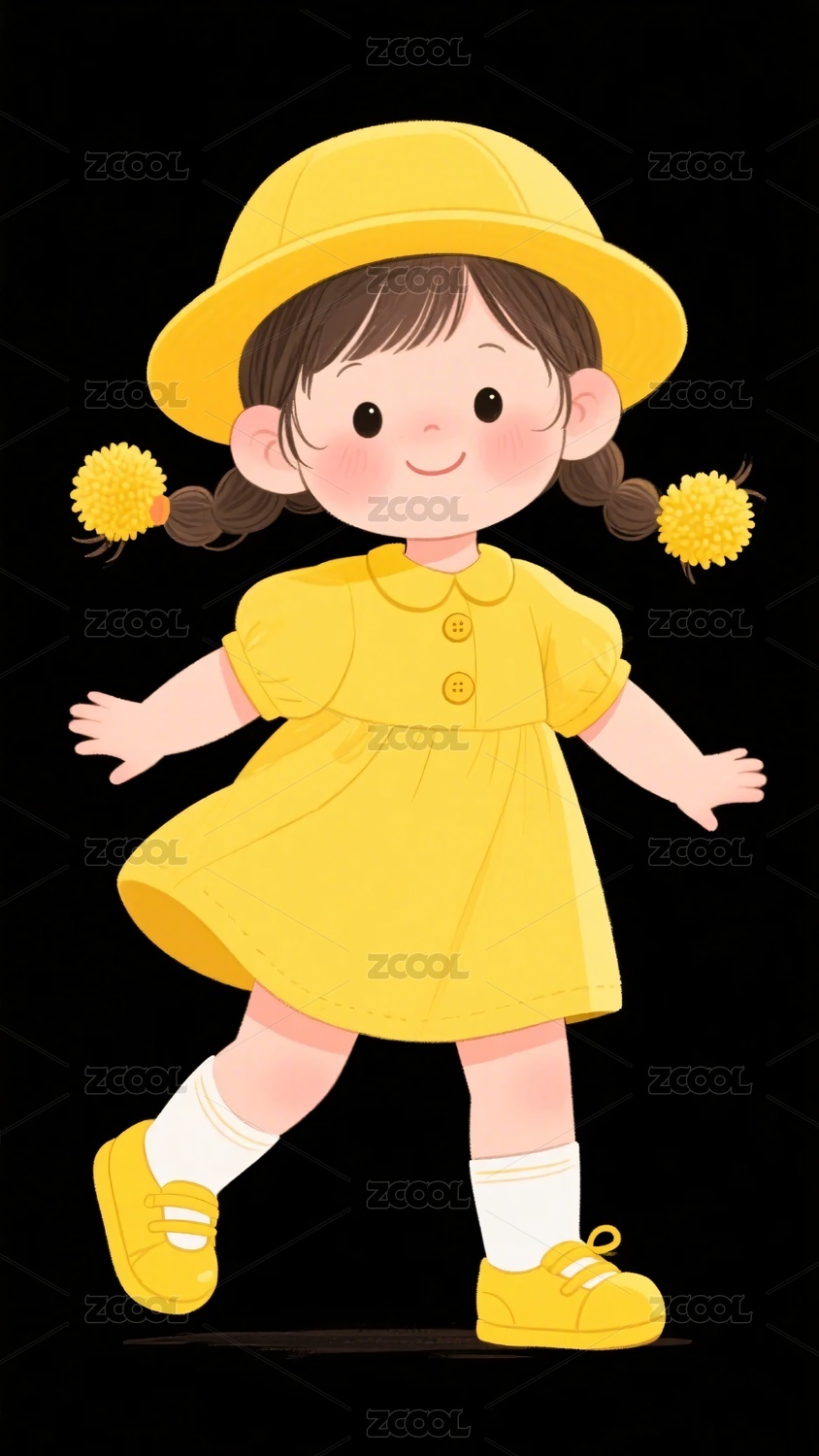 小女孩,黄衣,黄帽,双辫,插画,卡通,可爱,童趣,服装,儿童