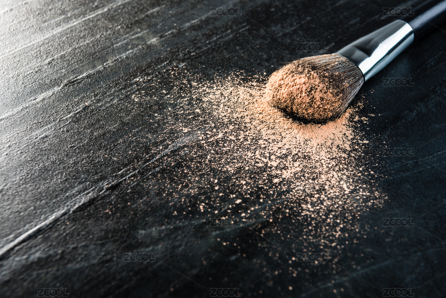 时尚化妆刷上黑色石头纹理地板背景与设计空区域粉碎粉状粉底显示的高角度视图照片。