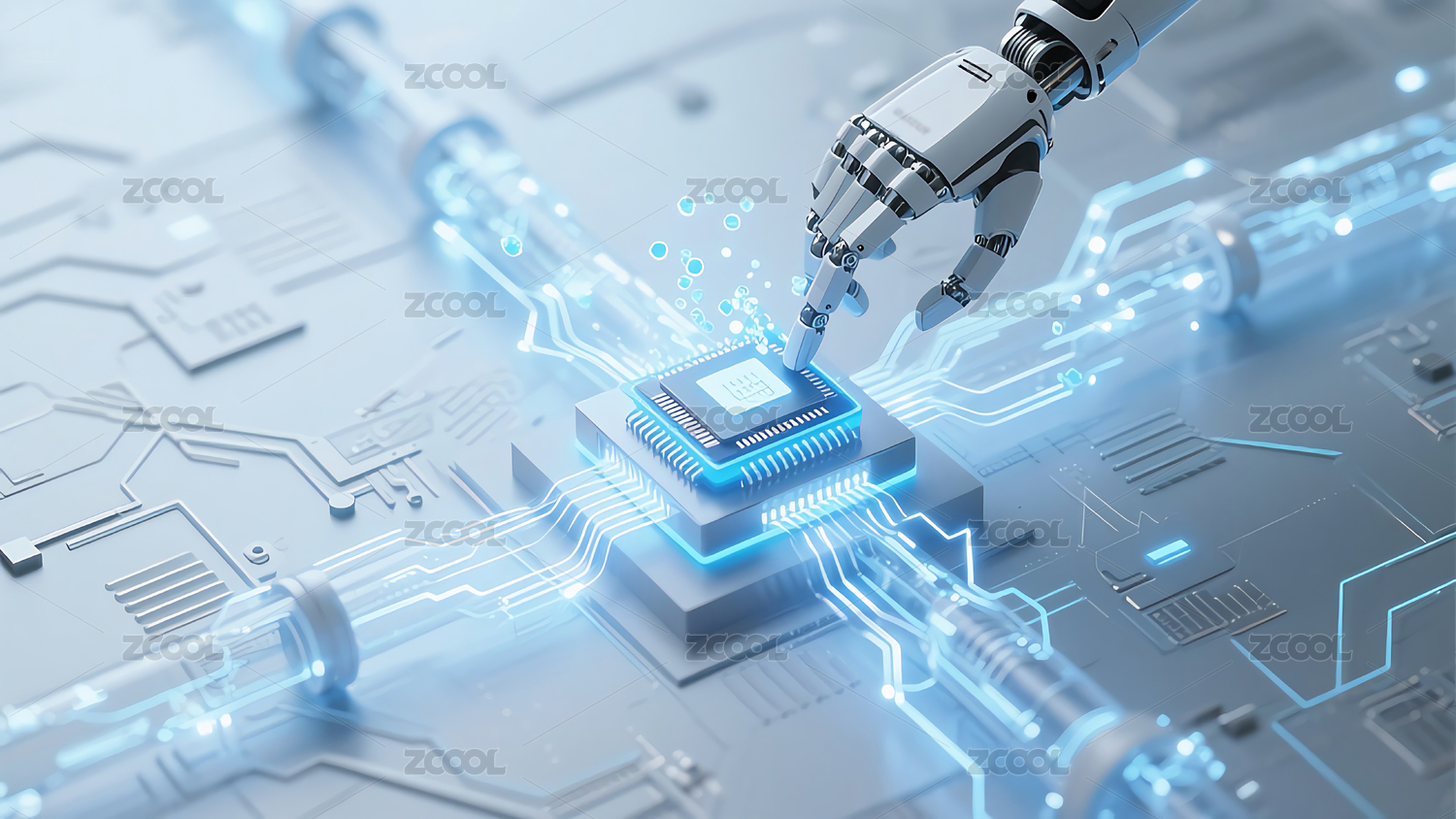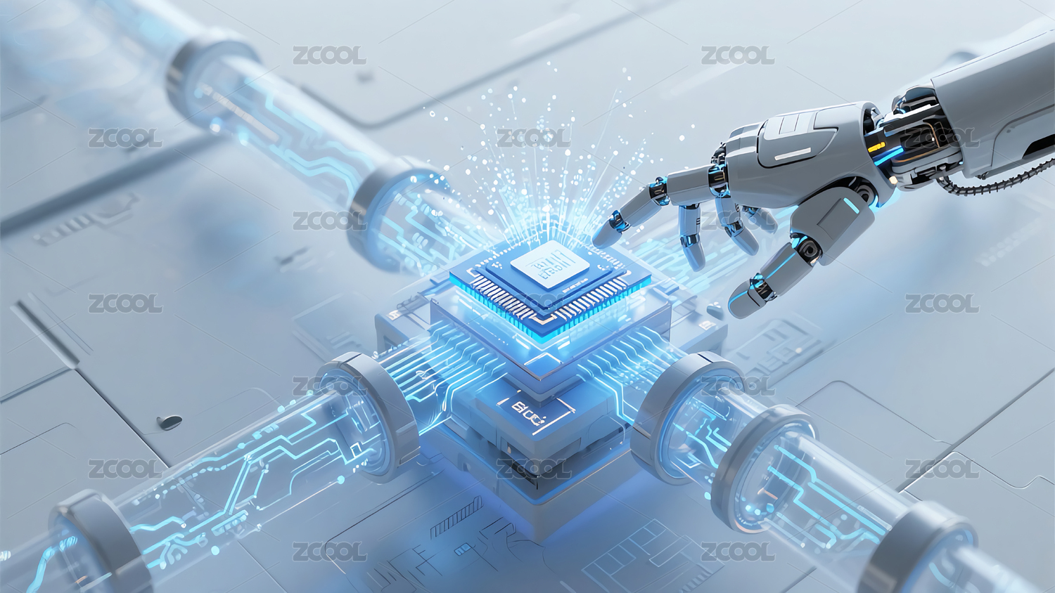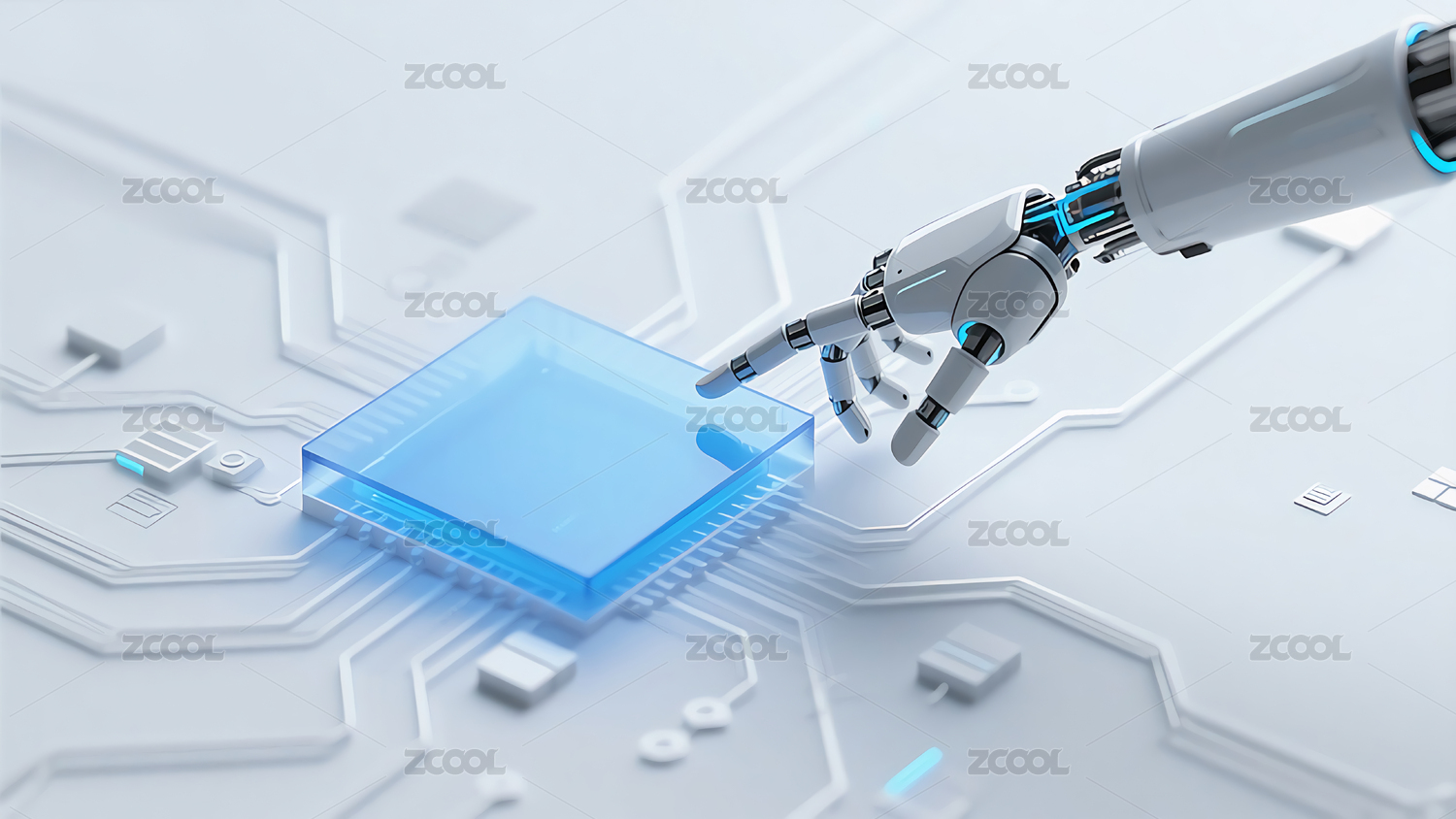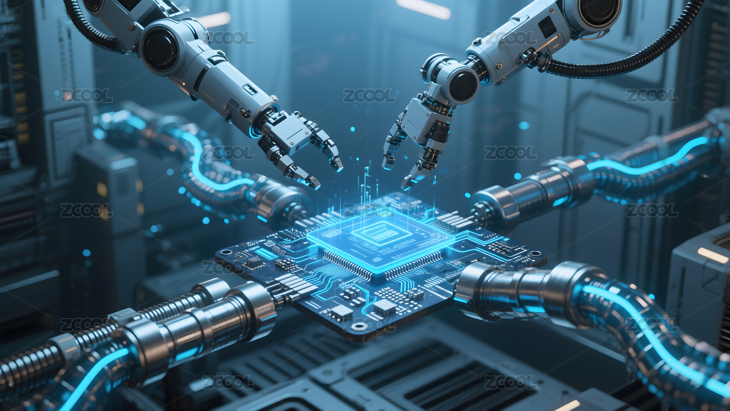 3D,AI芯片,背景,三维,场景,蓝色,光影,机器人,机械臂,触碰