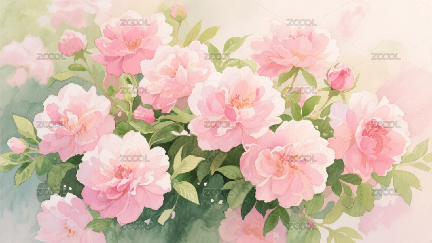 金色,光点,粉色,花瓣,清新,雅致,牡丹,绿叶,浅绿,淡蓝