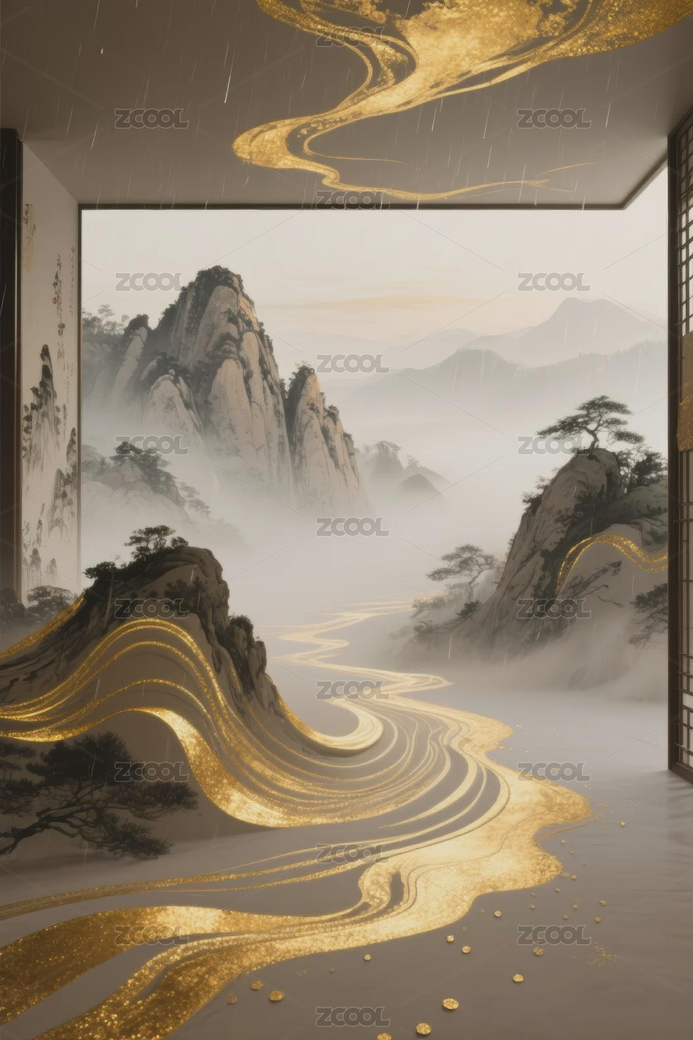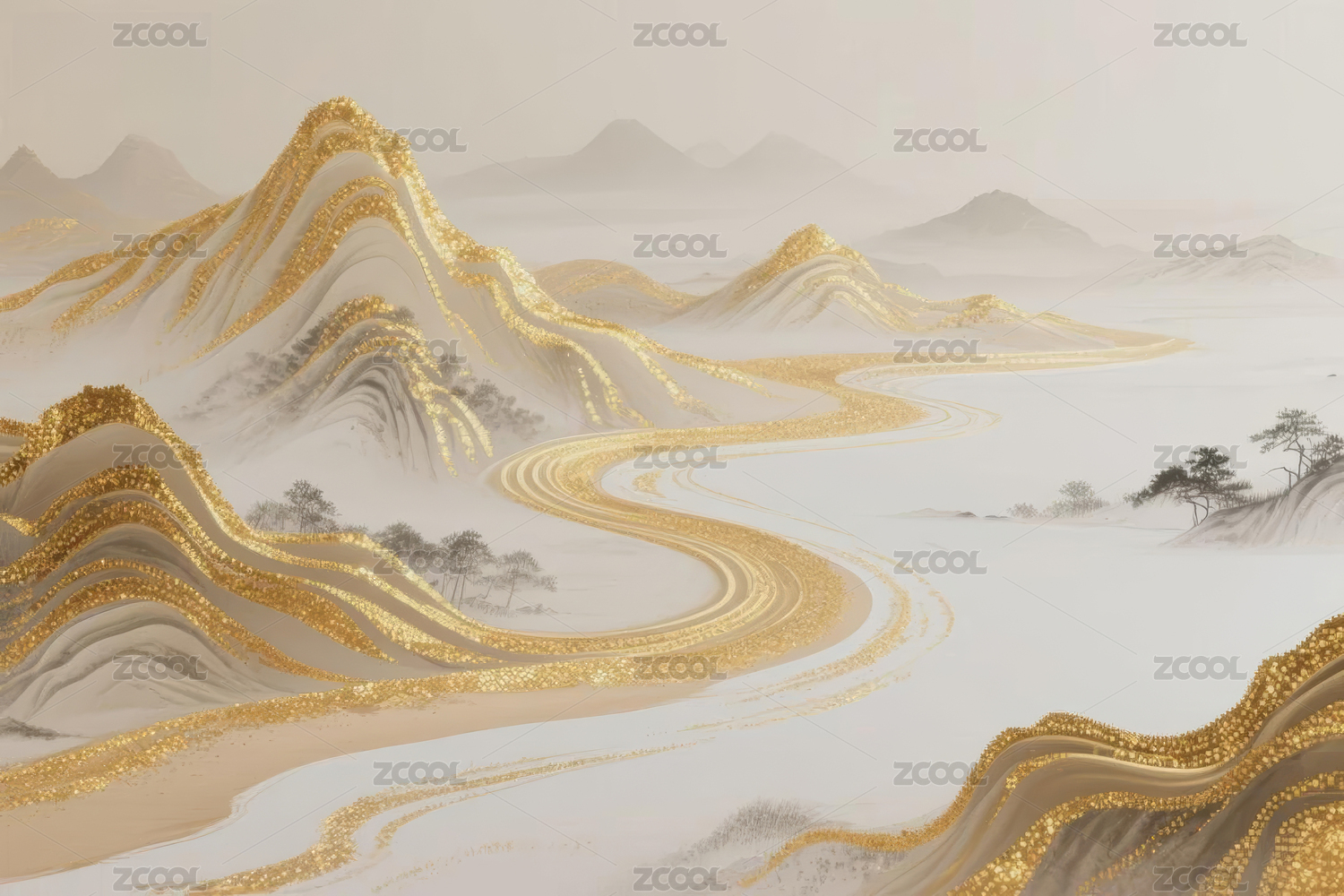 金色, 山水, 云雾, 山峰, 河流, 自然, 艺术, 风景, 传统, 流动