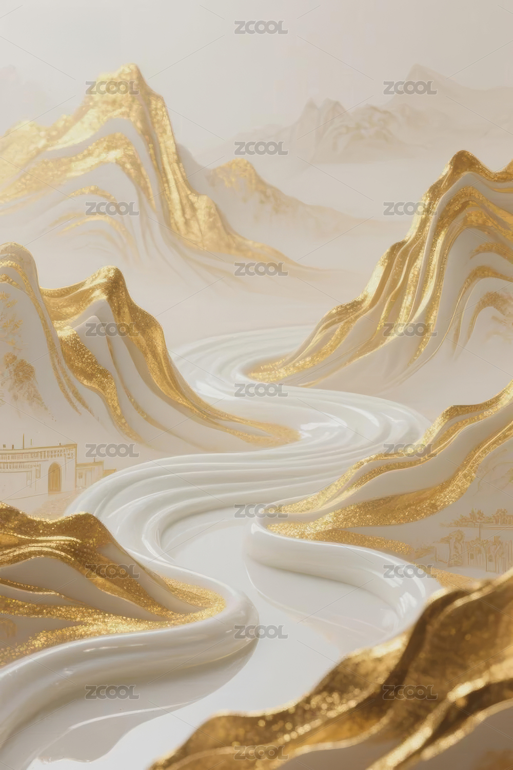 金色山川流动抽象画