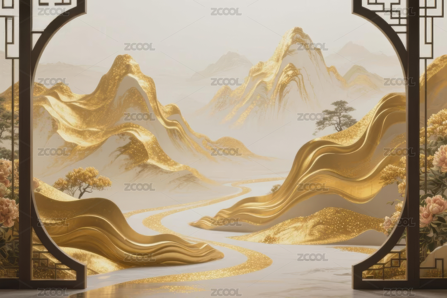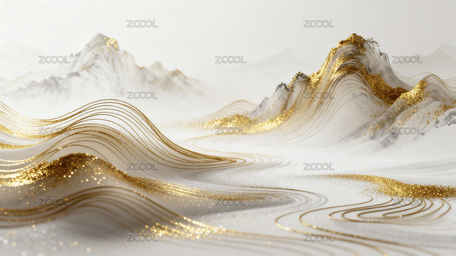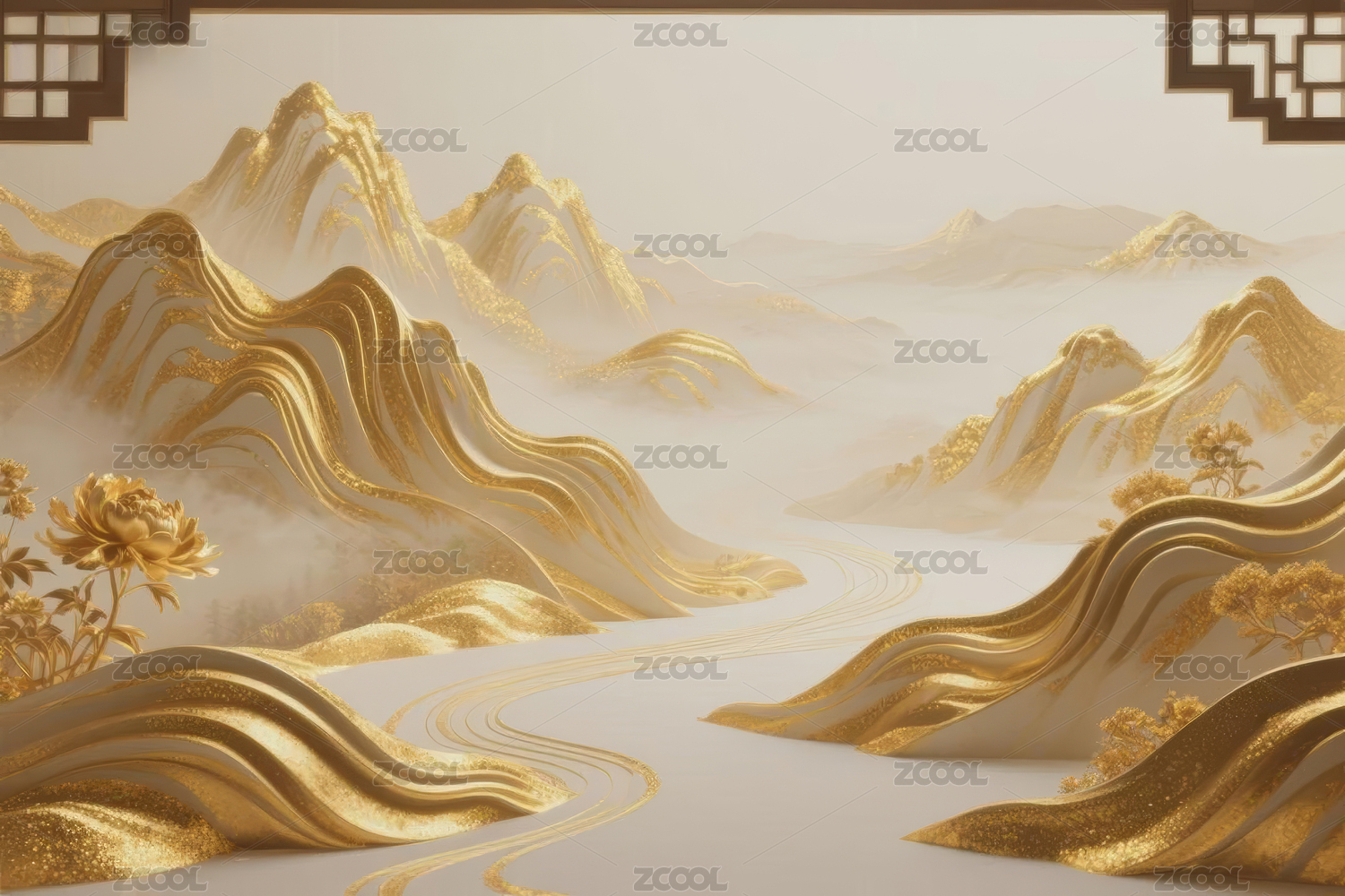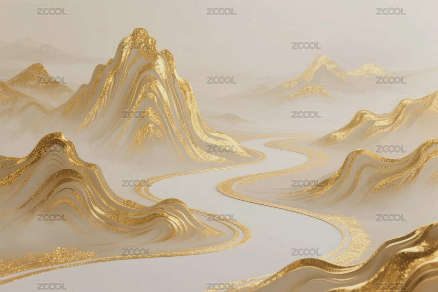 金色, 云雾, 山峰, 梦幻, 自然, 艺术, 装饰, 现代, 设计, 抽象