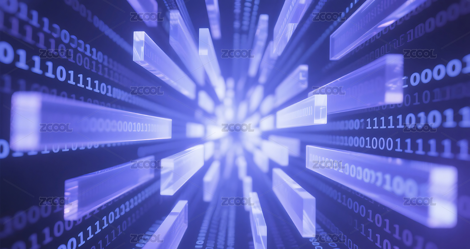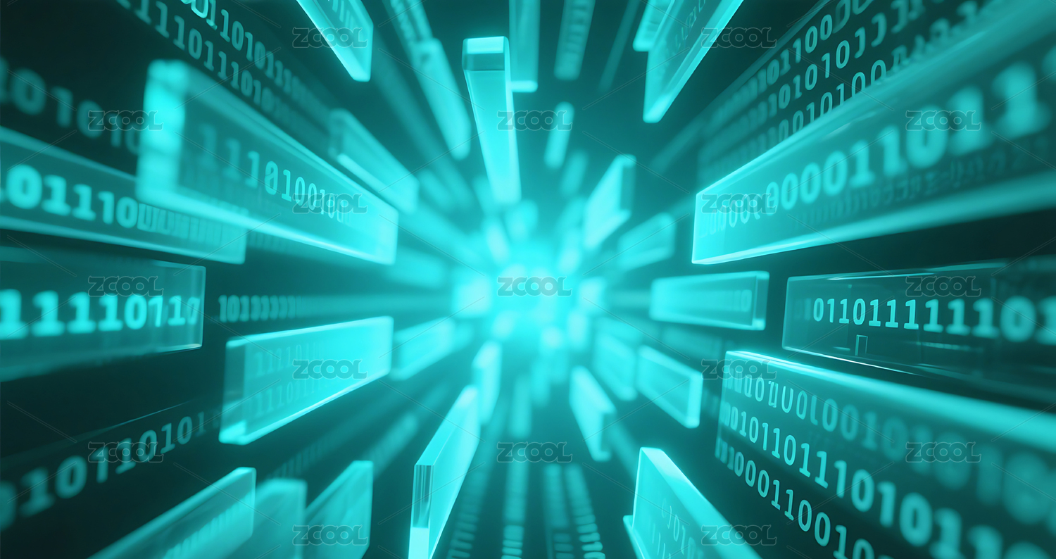 蓝绿色立体玻璃条块和代码向四周扩散背景