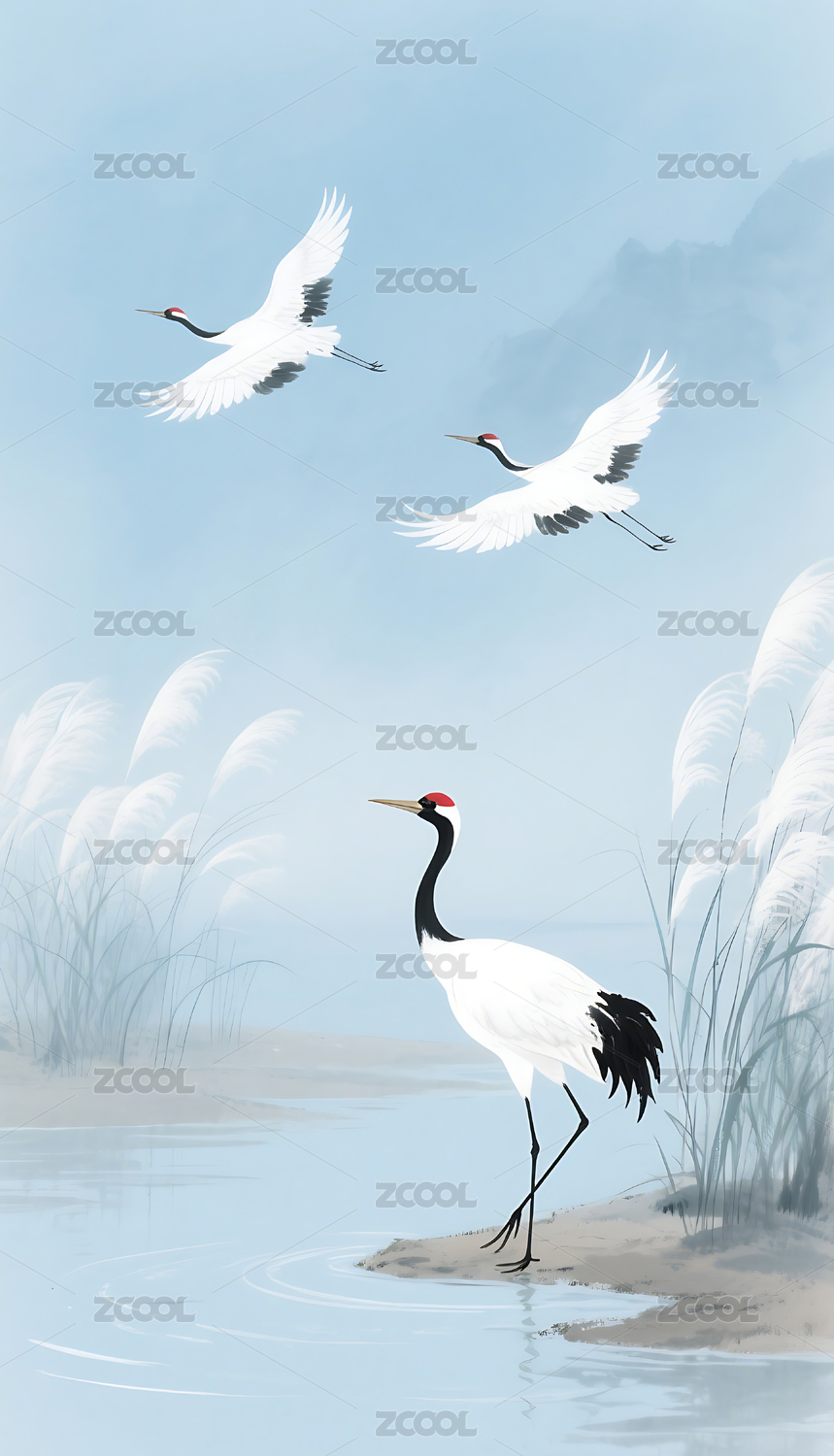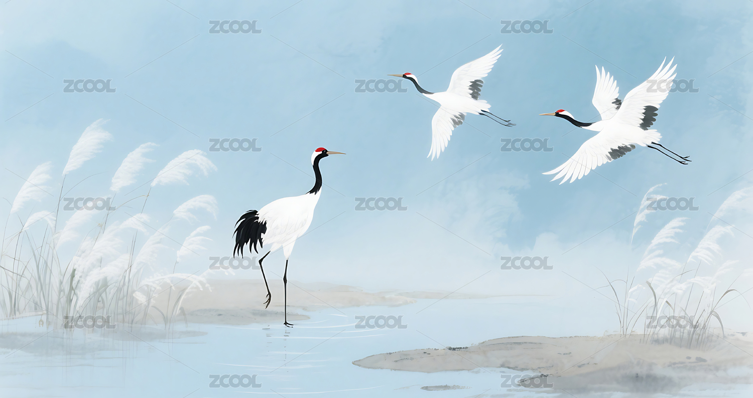 中国风湖边的仙鹤