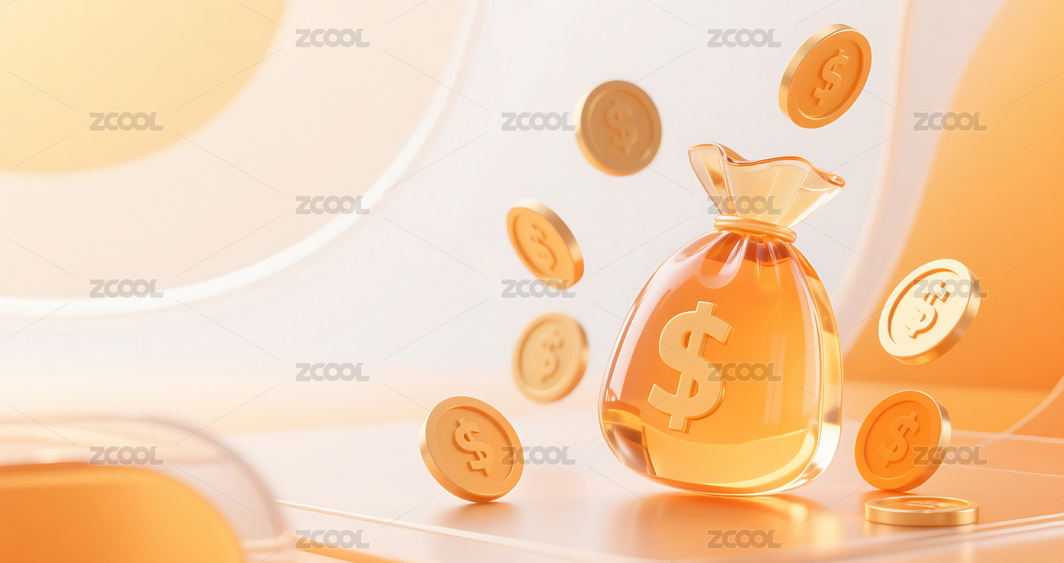 橙色3D立体玻璃质感钱袋金币背景