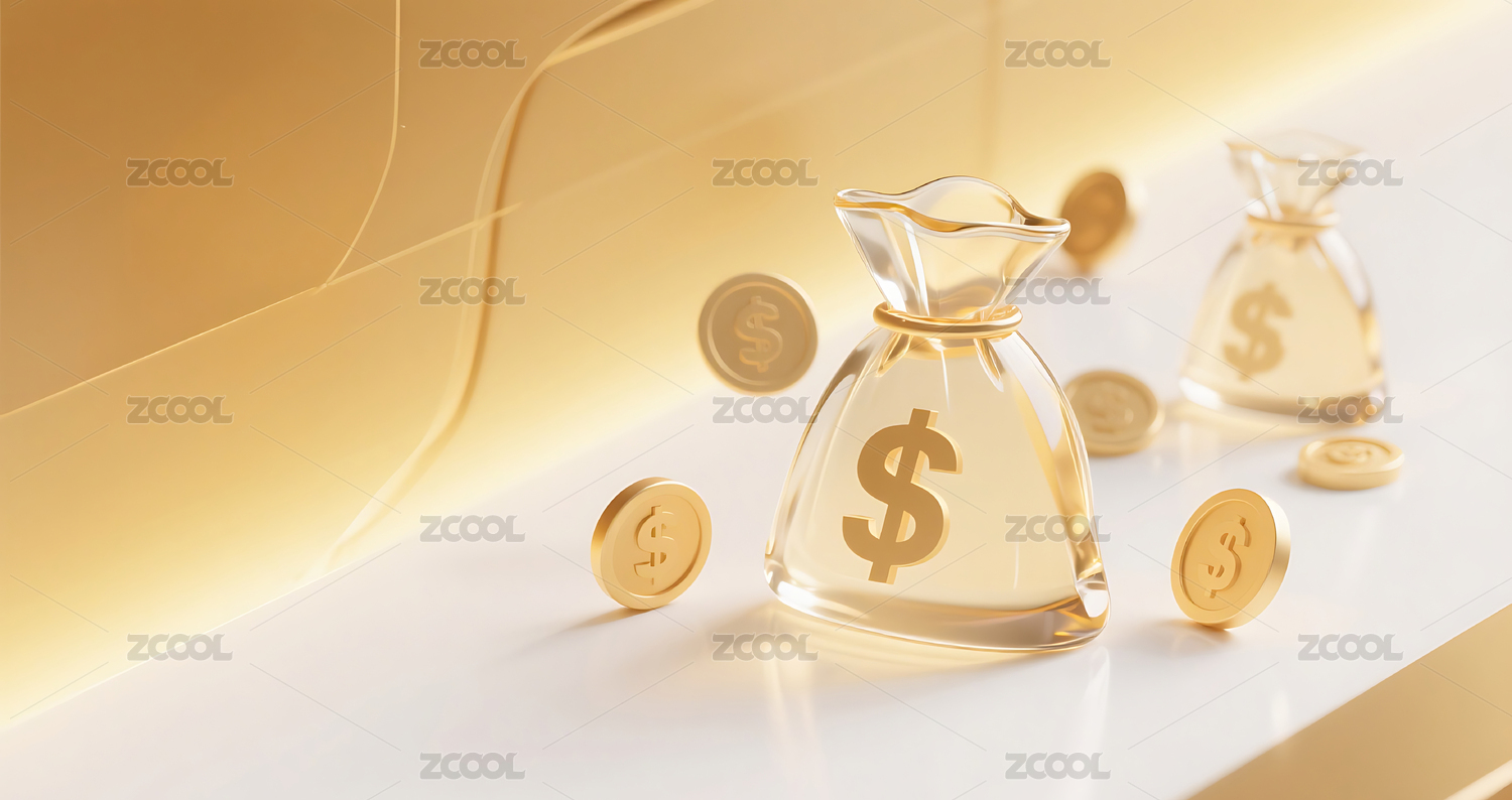 金色3D立体玻璃质感钱袋金币背景