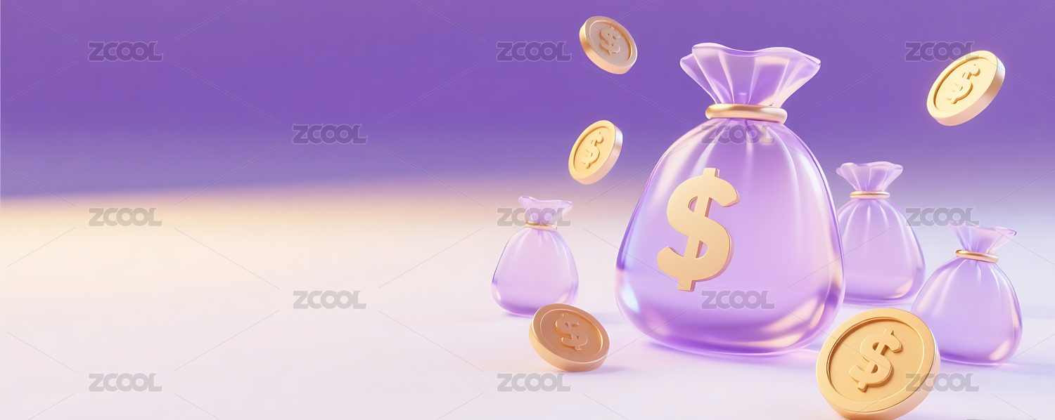 紫色3D立体玻璃质感钱袋金币背景