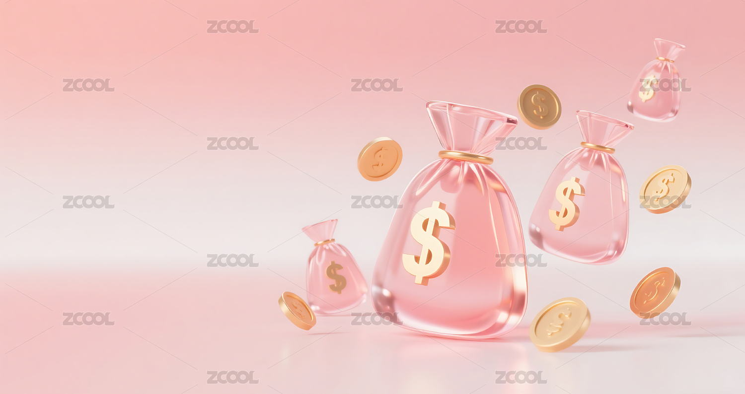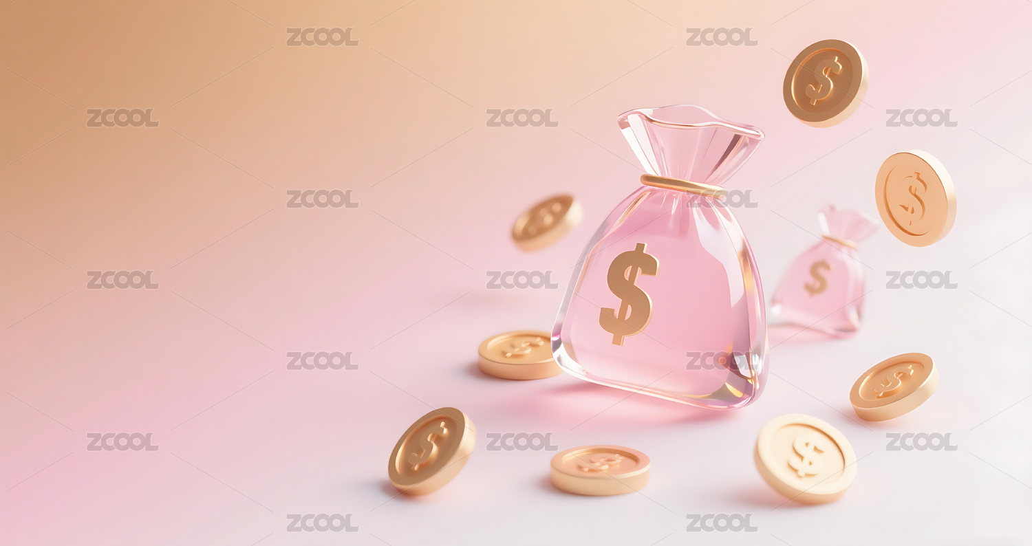 粉色3D立体玻璃质感钱袋金币背景
