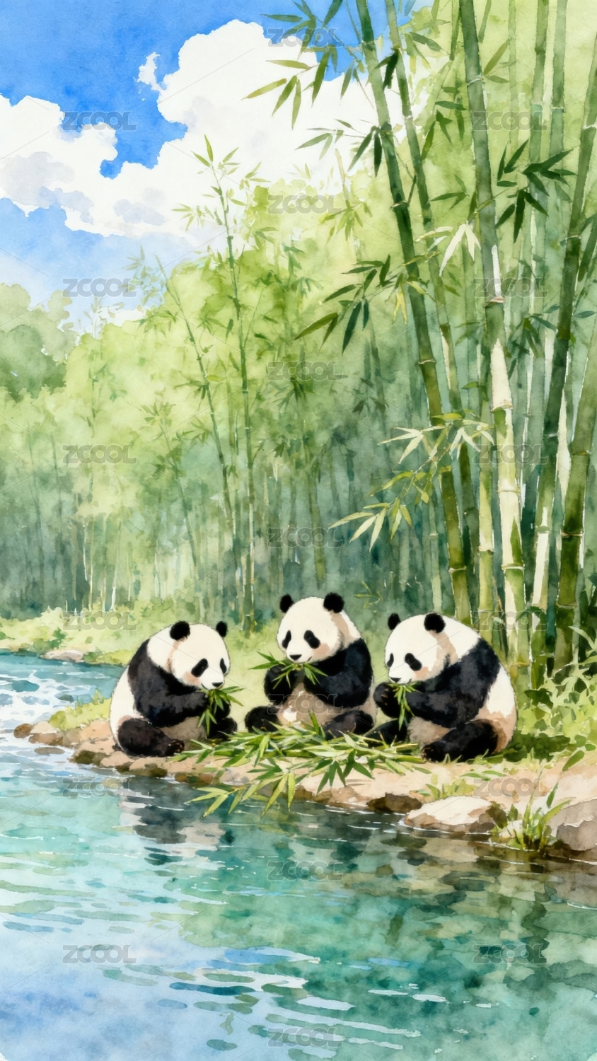 熊猫食竹手绘插画