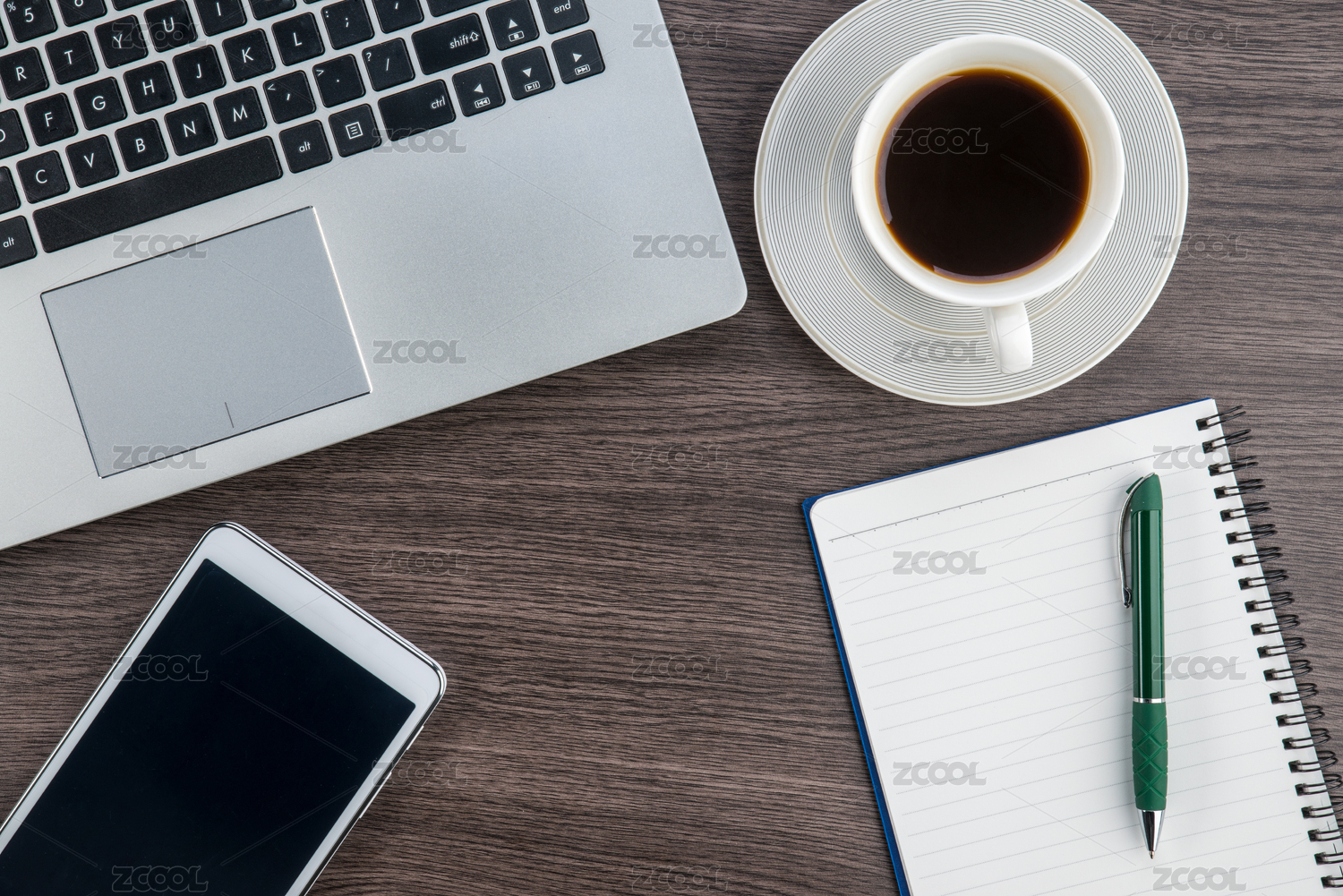 笔记本电脑手机和平板笔记本和咖啡的桌子上的杯子