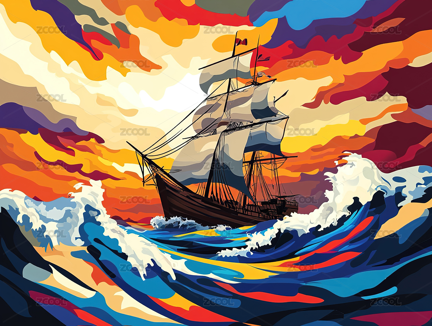 3D,艺术,海浪,小船,彩色,背景,折纸,纸雕