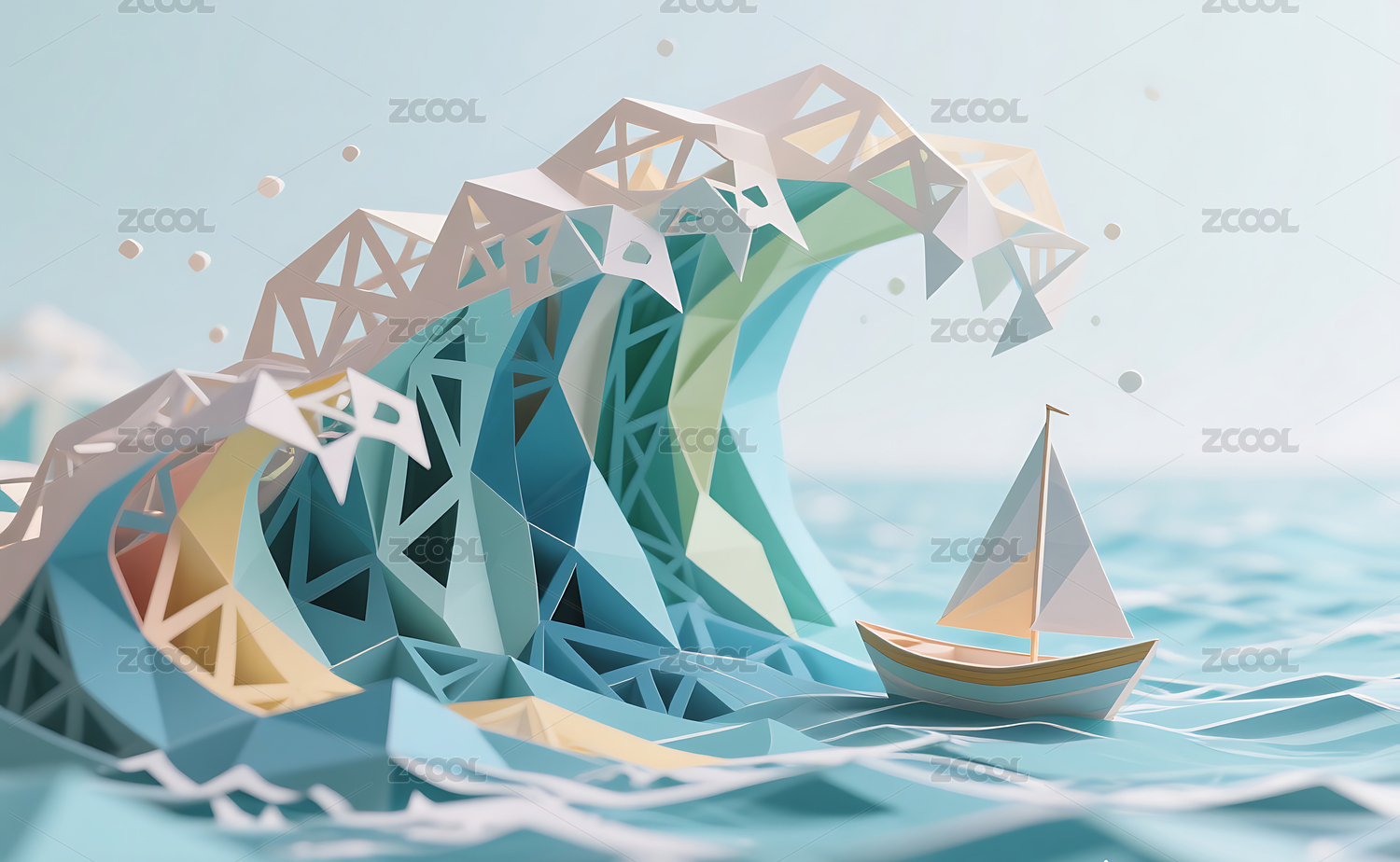 3D彩色纸雕艺术的海浪和小船