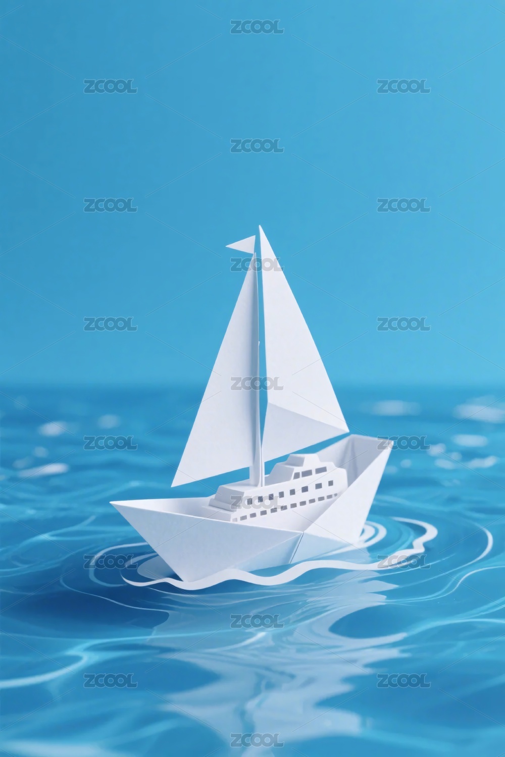 蓝色水面上的白色纸帆船