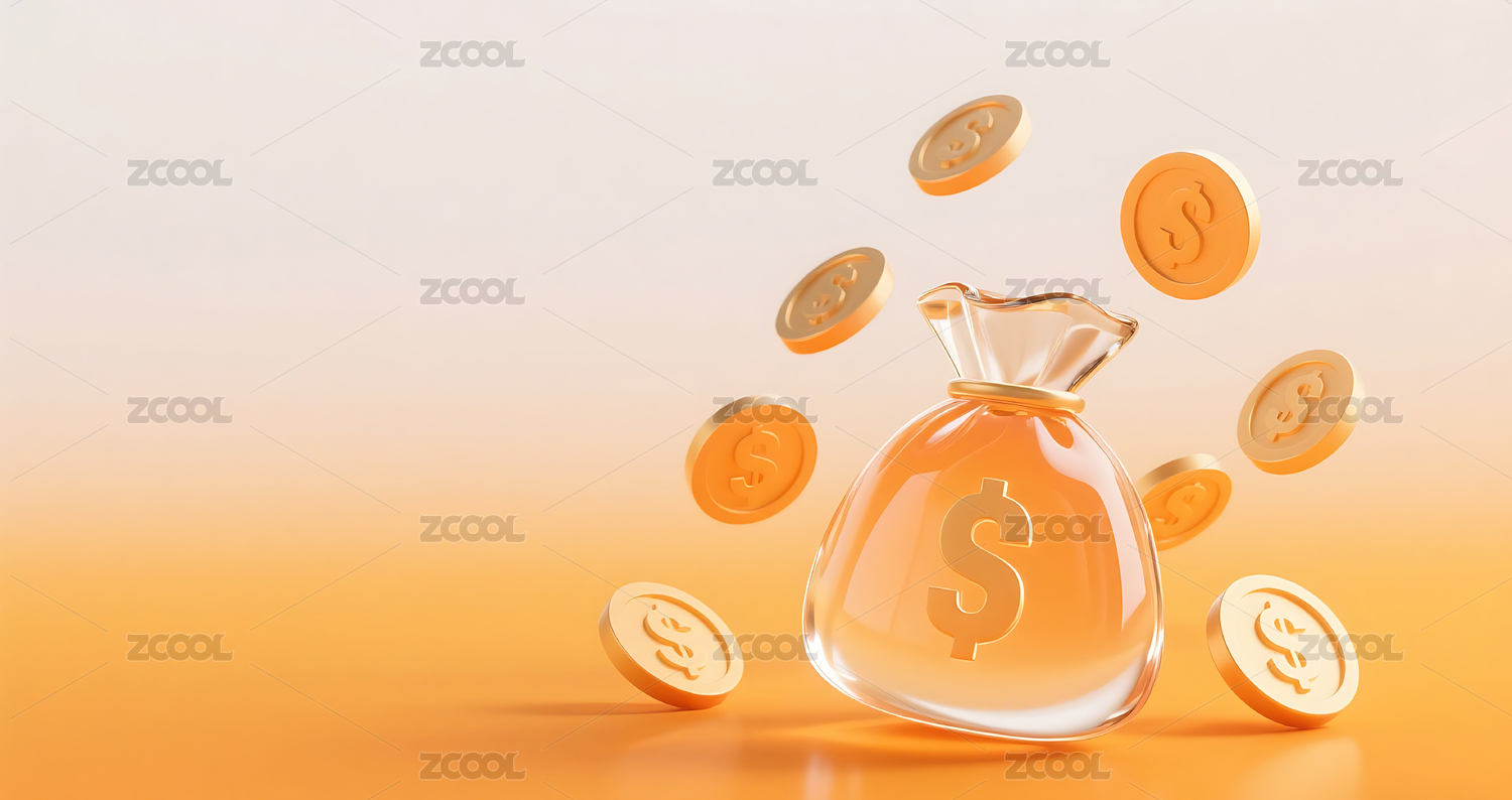 橙色3D立体玻璃质感钱袋金币背景