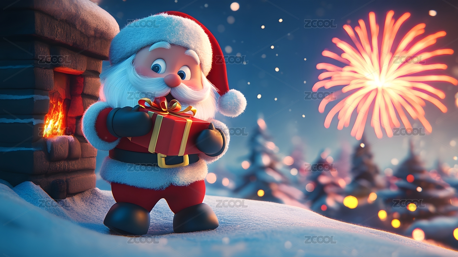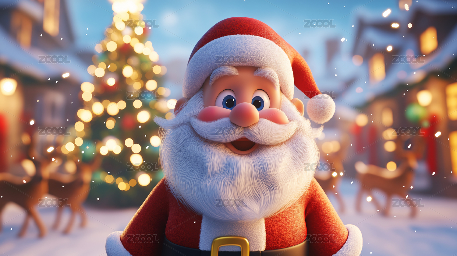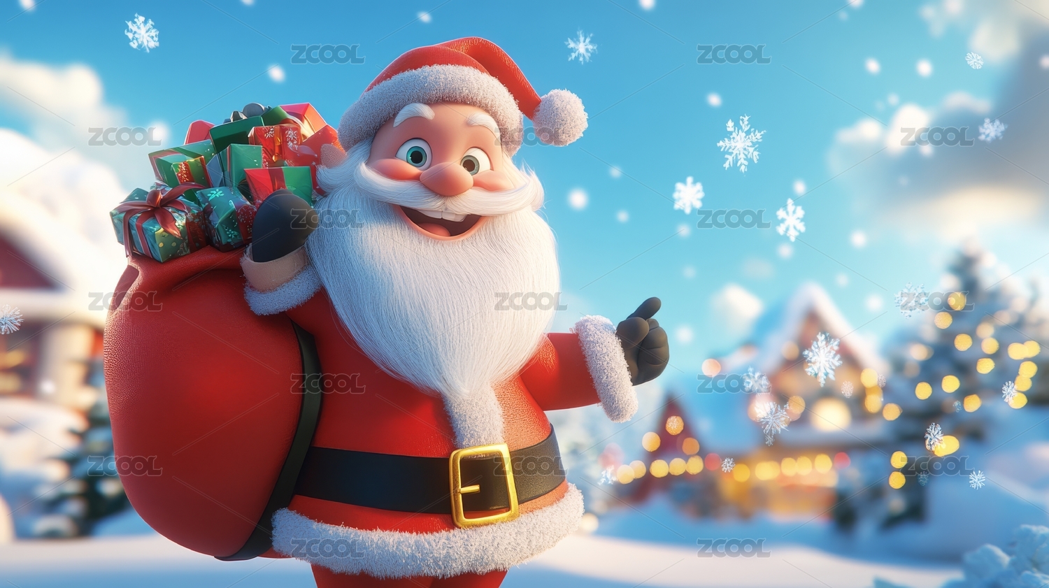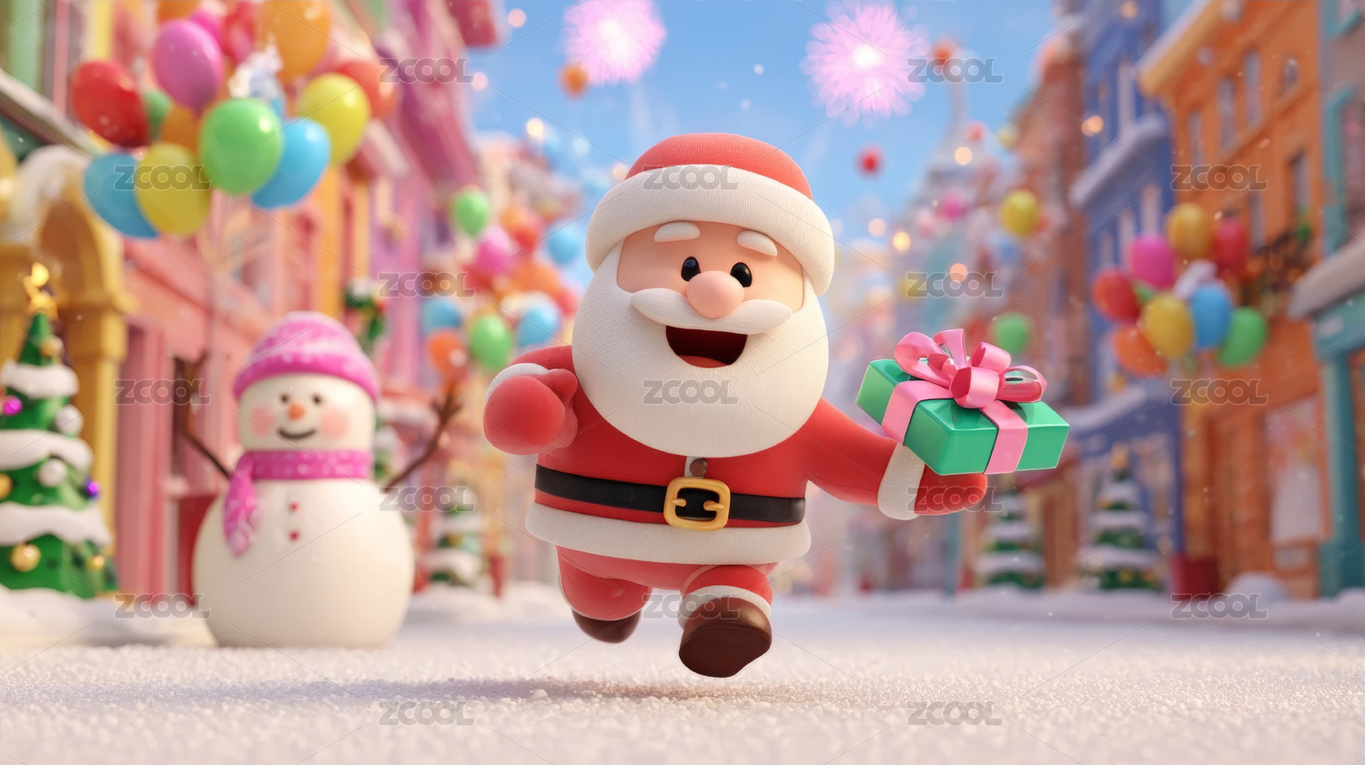 3D卡通插画正在小镇上送礼物的圣诞老人
