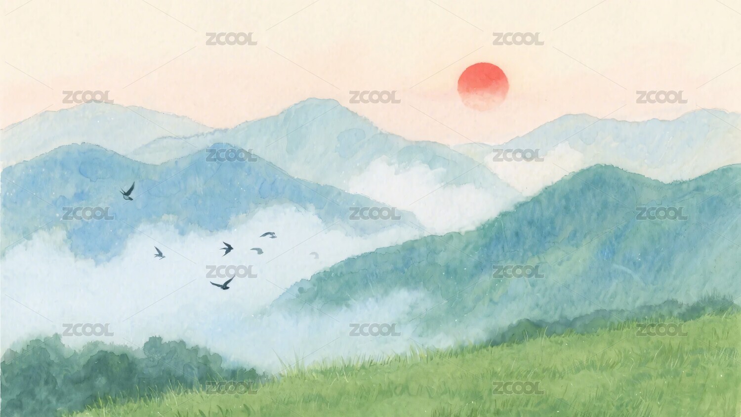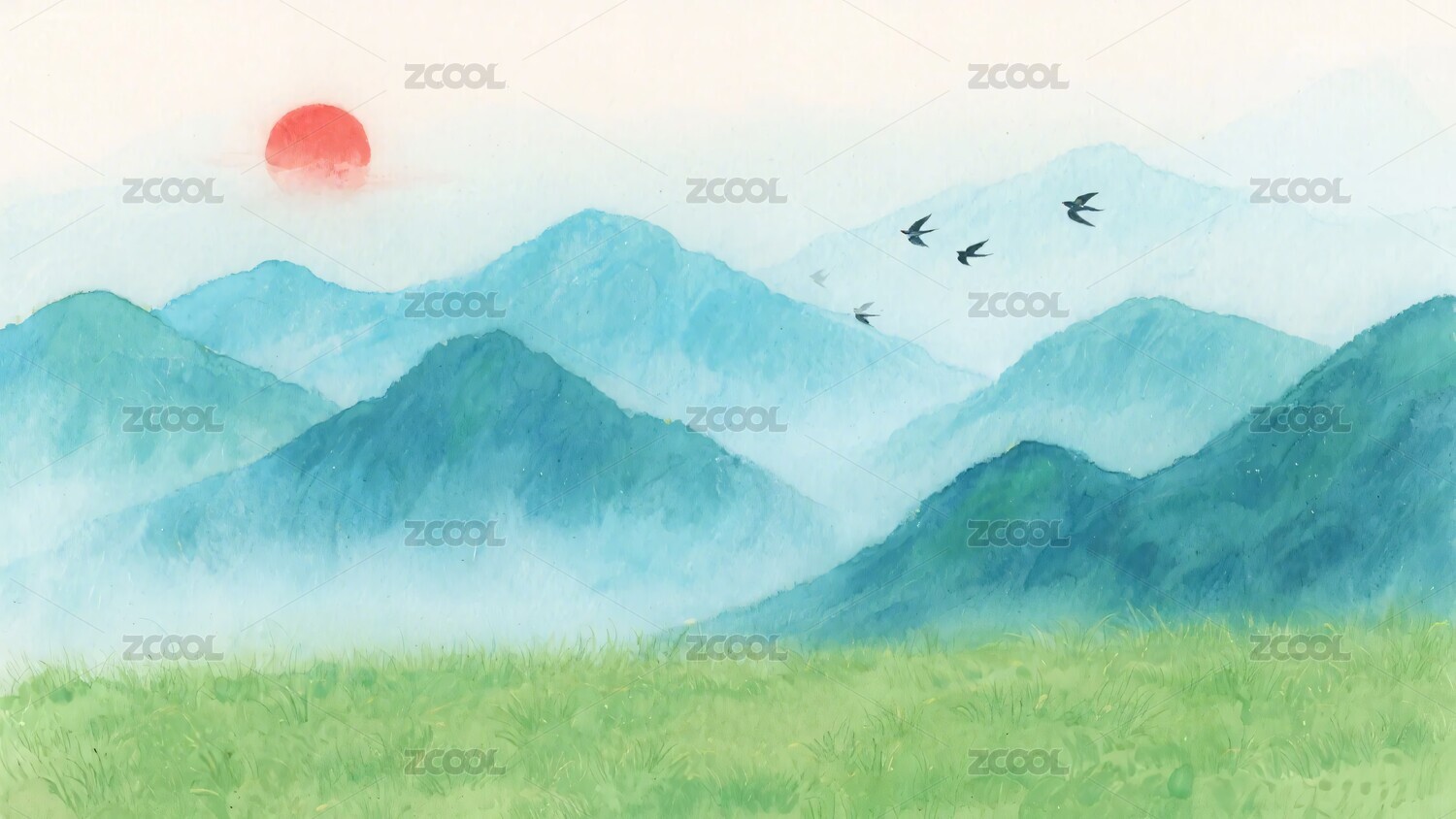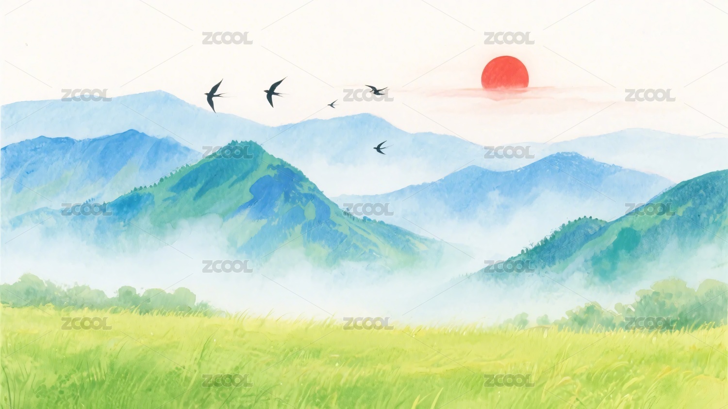 山间飞鸟与绿野风景图