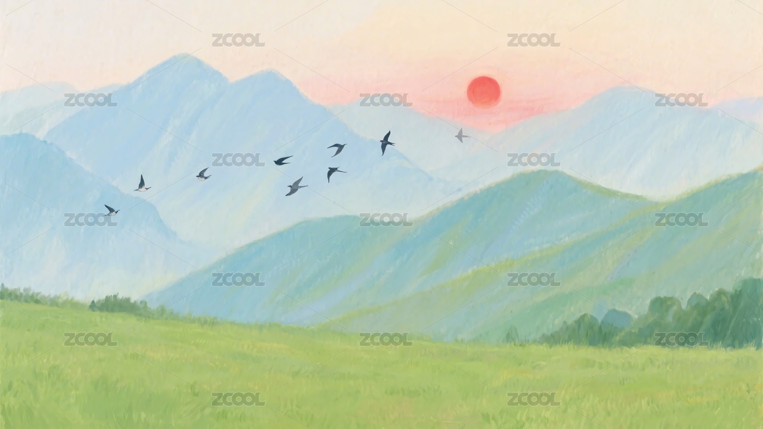 山间夕阳飞鸟美景插画