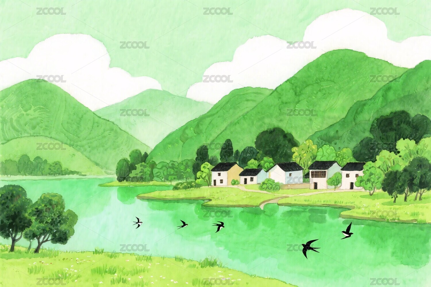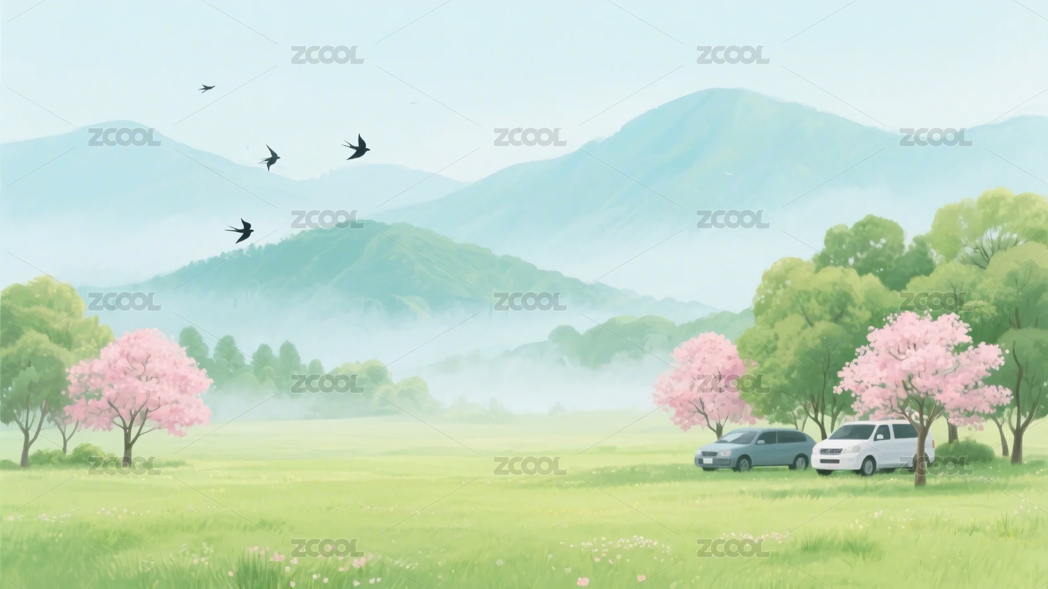 飞鸟,草地,风景,插画,自然,清新,宁静,优美,自然景观,艺术