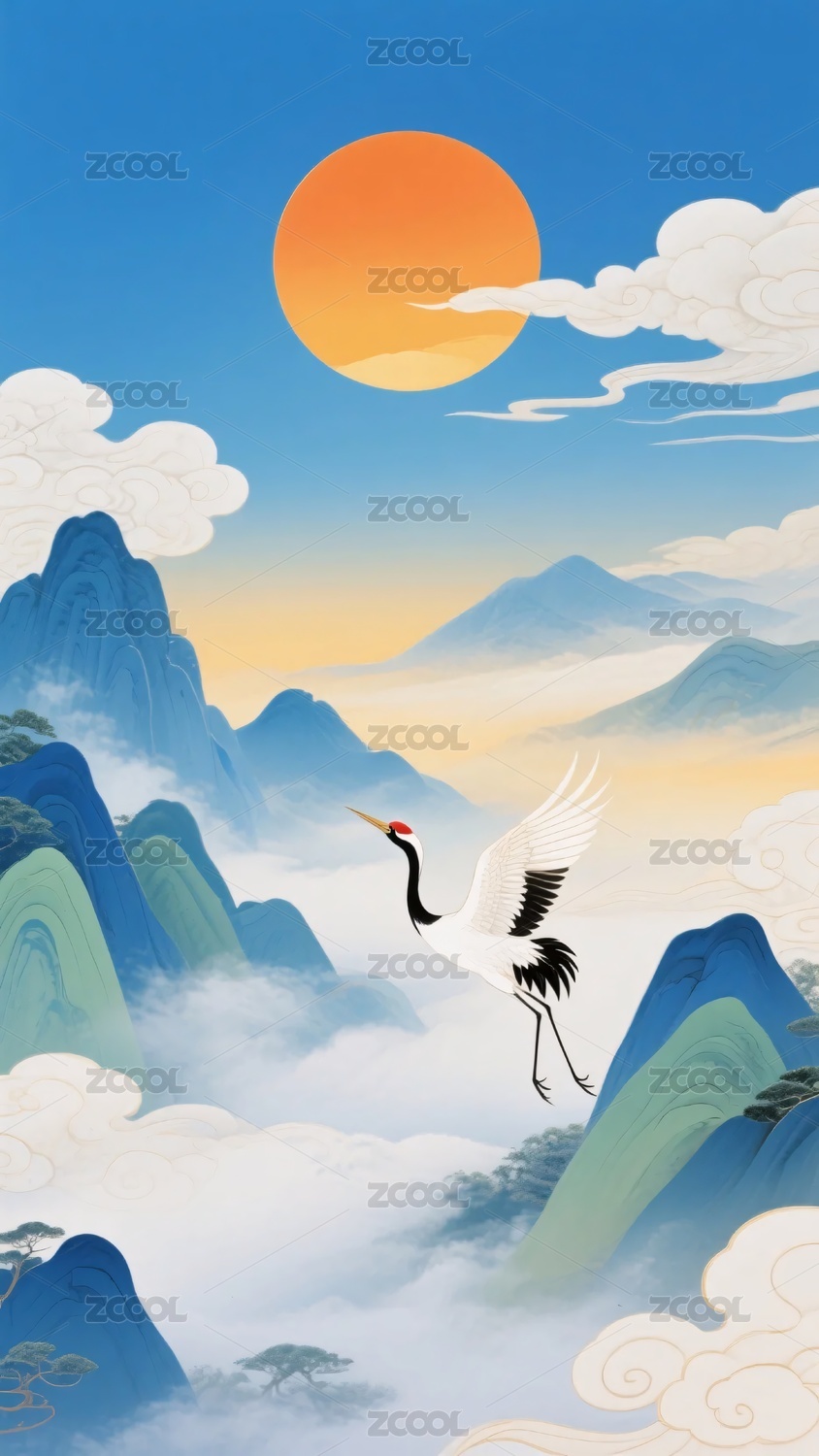 仙鹤,山川,云海,太阳,插画,自然,风景,飞鸟,艺术,中式