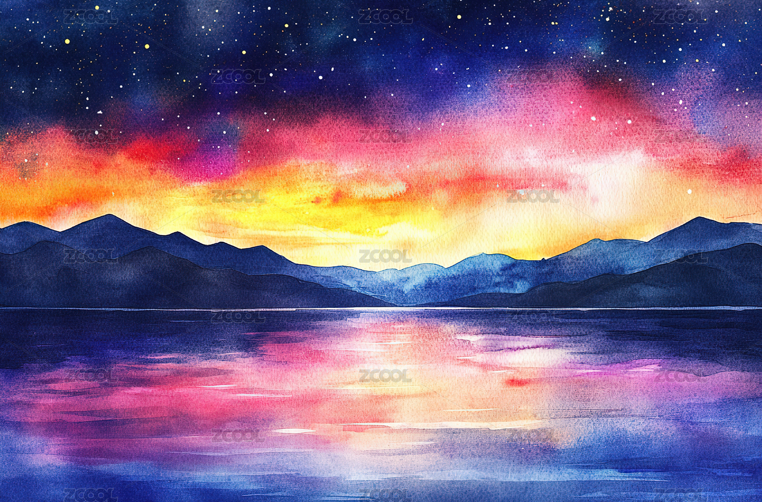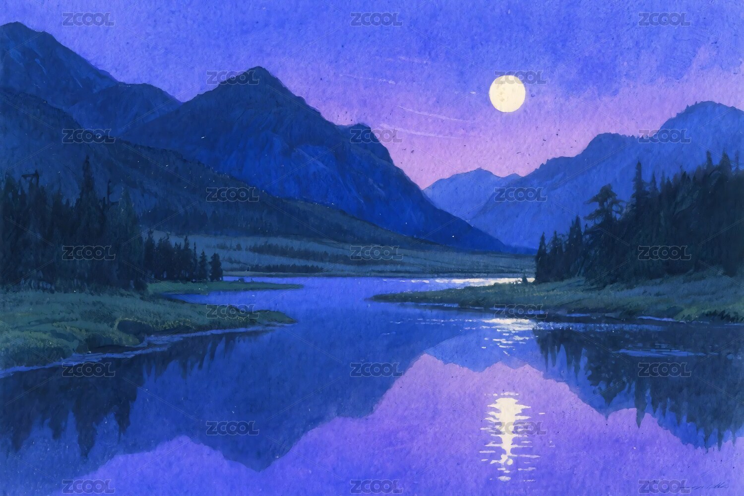 山水,湖泊,星空,夜晚,插画,静谧,风景,倒影,自然,蓝色