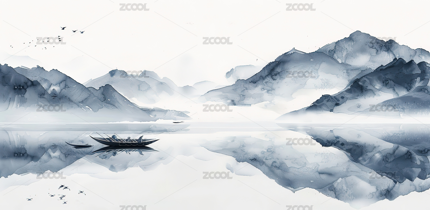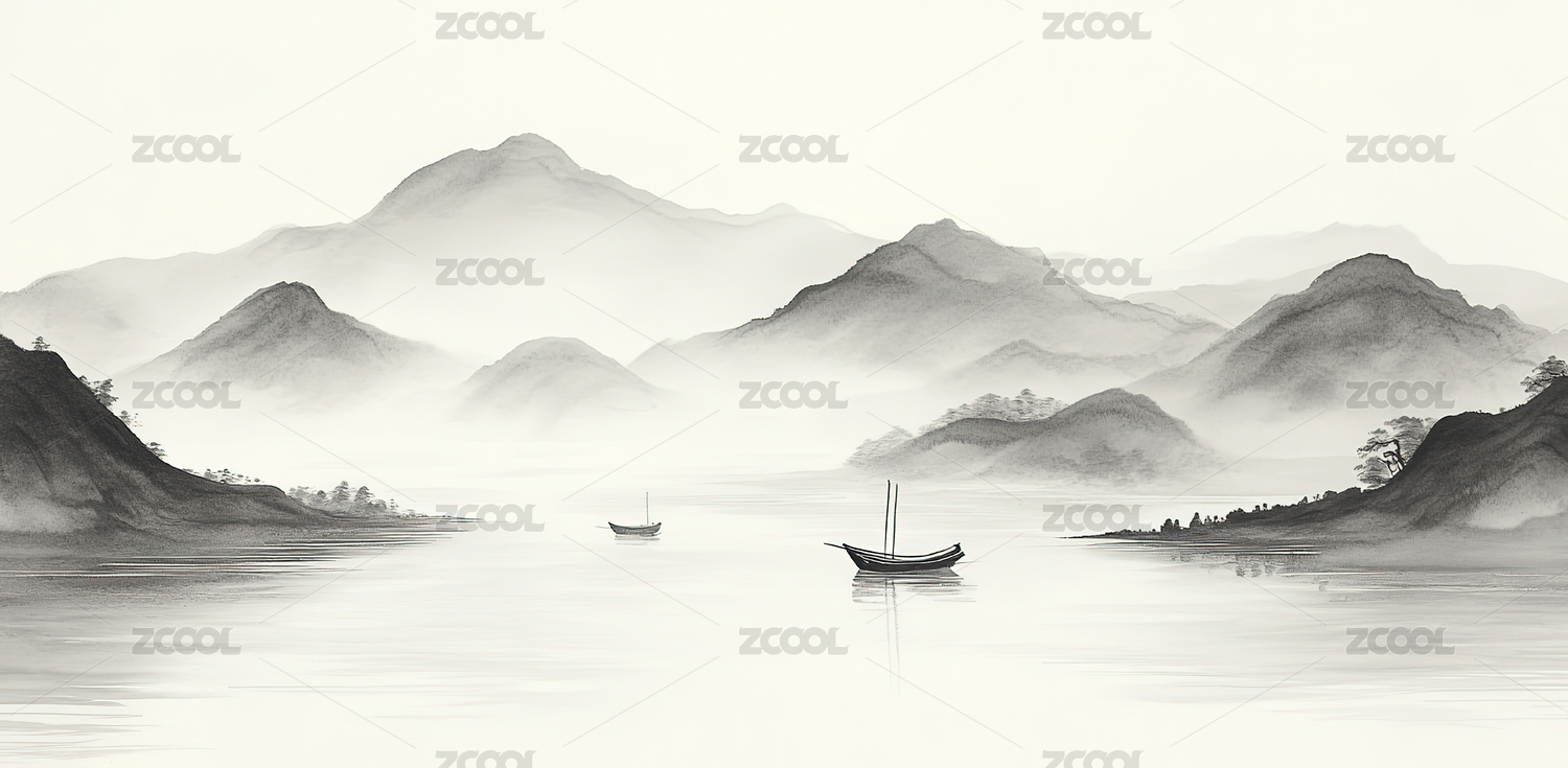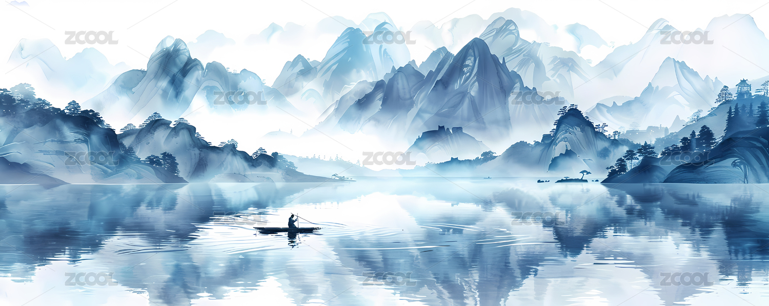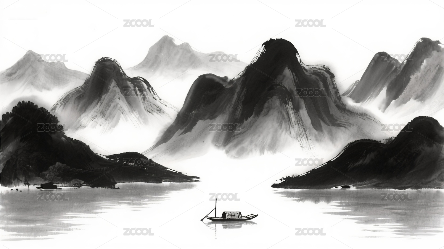 山水,孤舟,人物,水墨画,插画,意境,自然,宁静,中式,风景