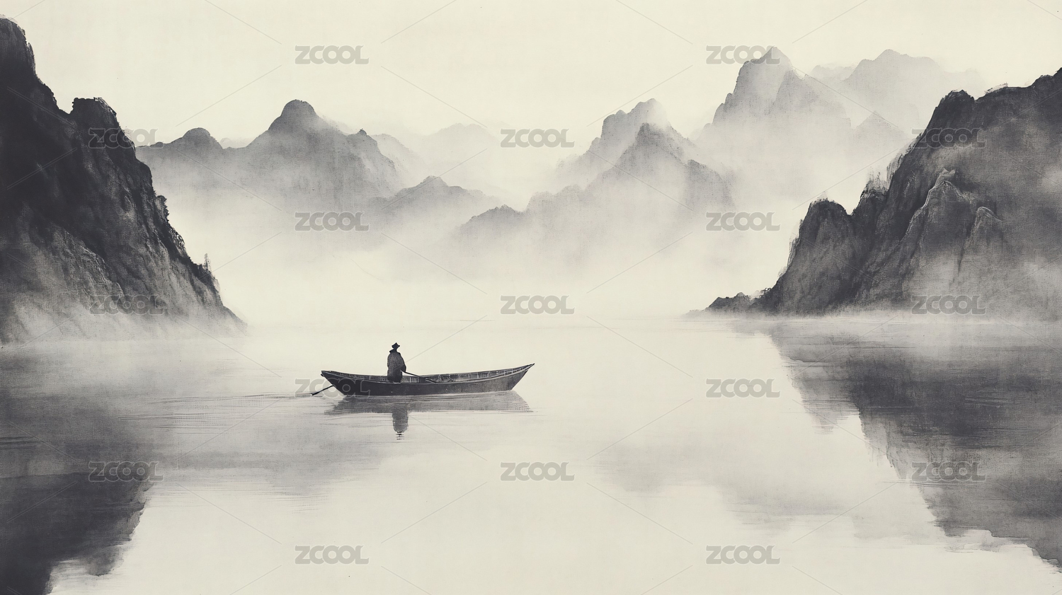 山水,孤舟,独行者,水墨画,意境,静谧,黑白,插画,自然,中式
