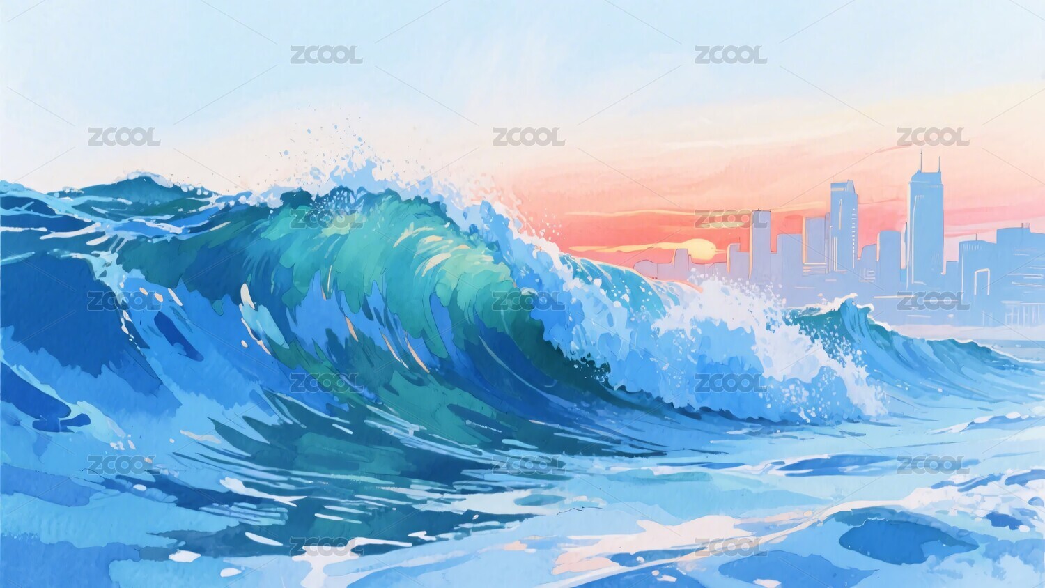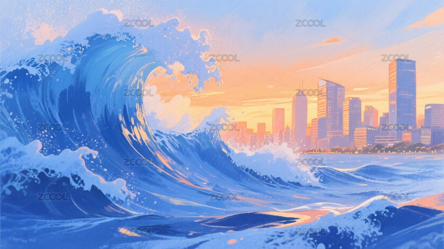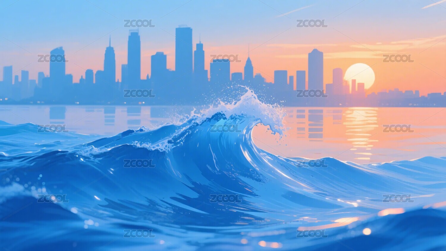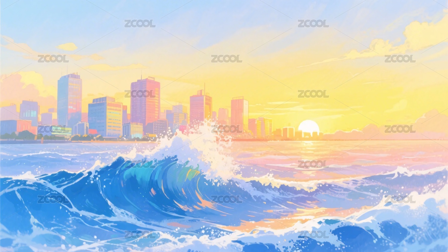 海浪,城市,日落,天空,海洋,插画,风景,自然,夕阳,霞光