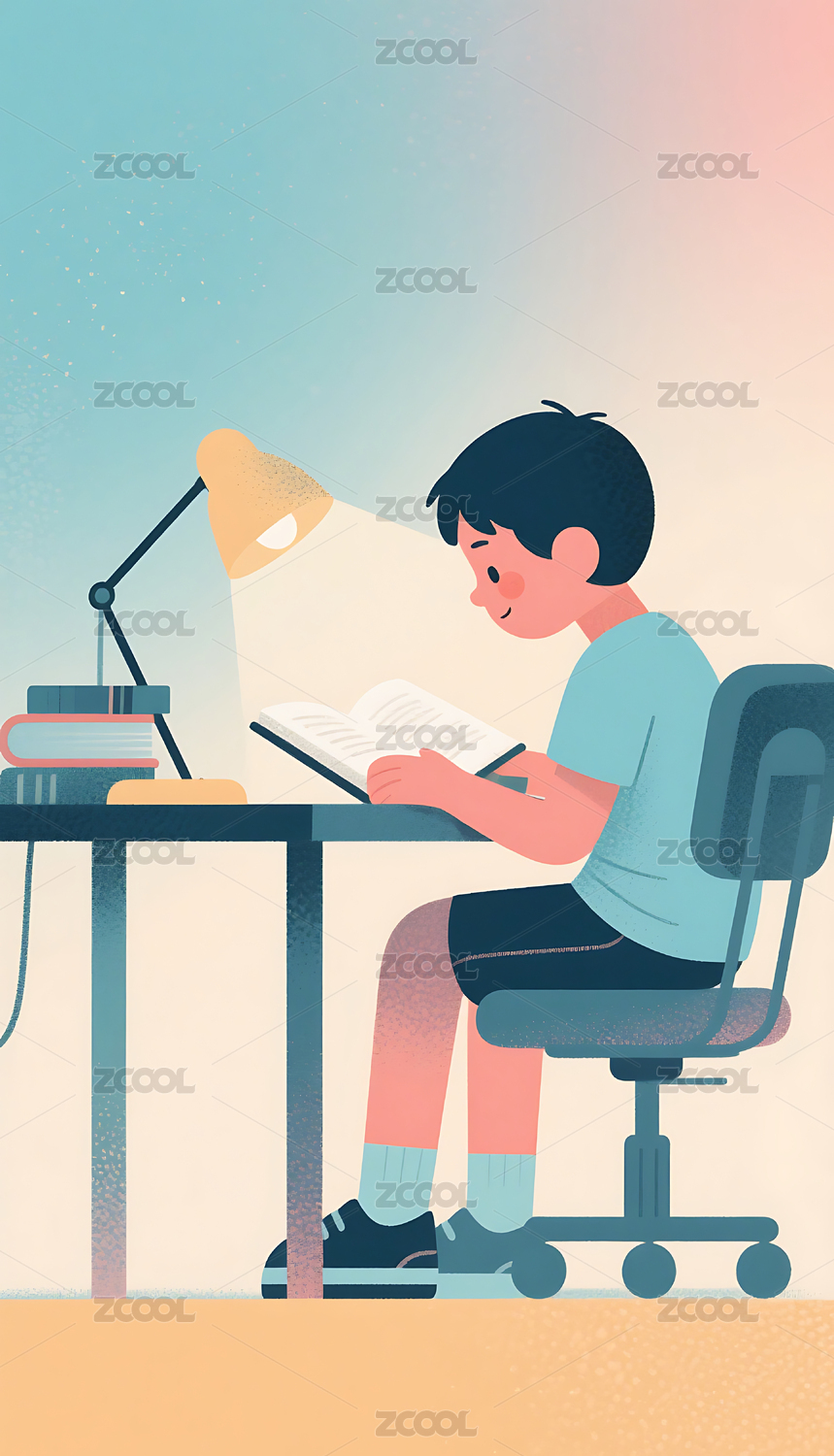 男孩在书桌上看书插画