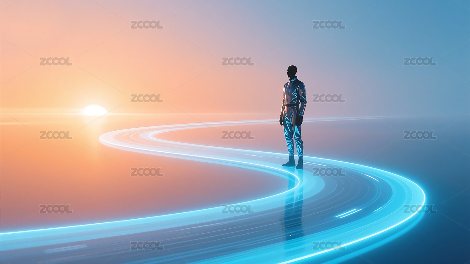 蓝色光带环绕的剪影人物