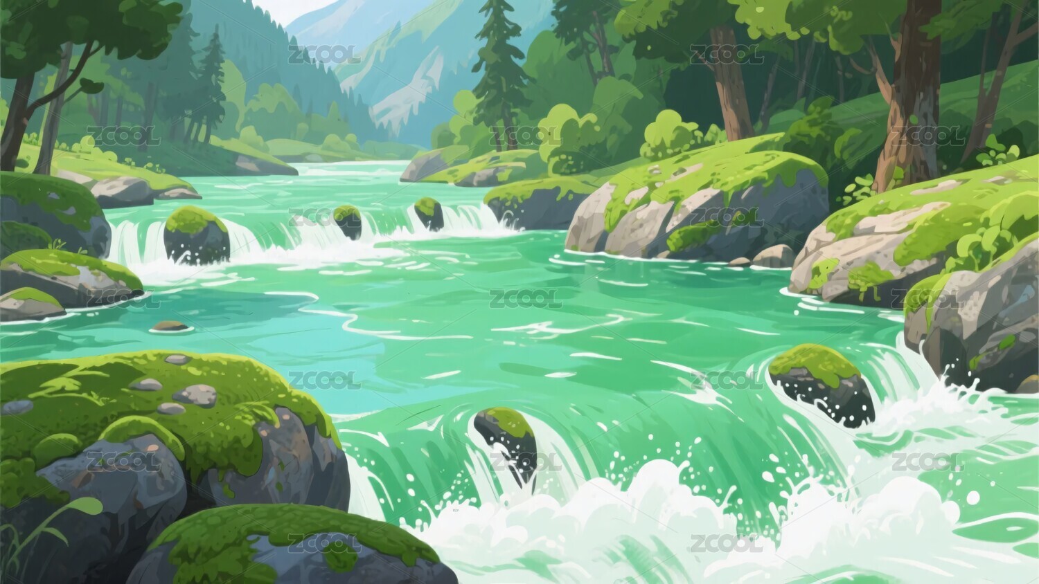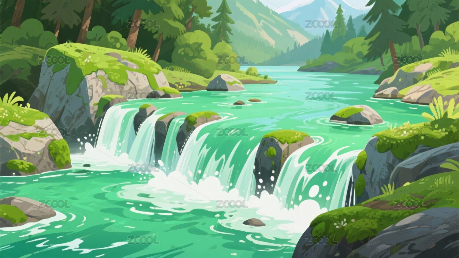 瀑布,河流,山石,山林,插画,自然,风景,绿色,景观,植物