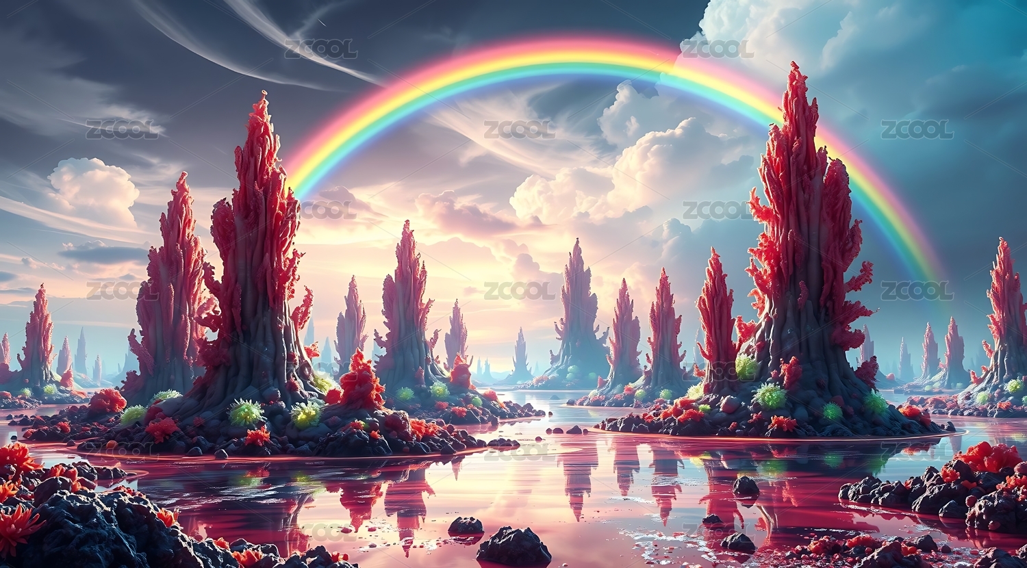 彩虹, 热带植物, 反射湖面,城堡,岛屿