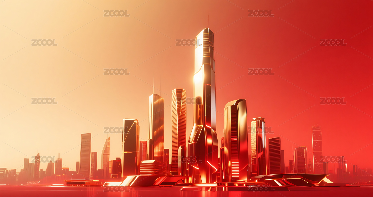 红色金属质感城市建筑天际线背景