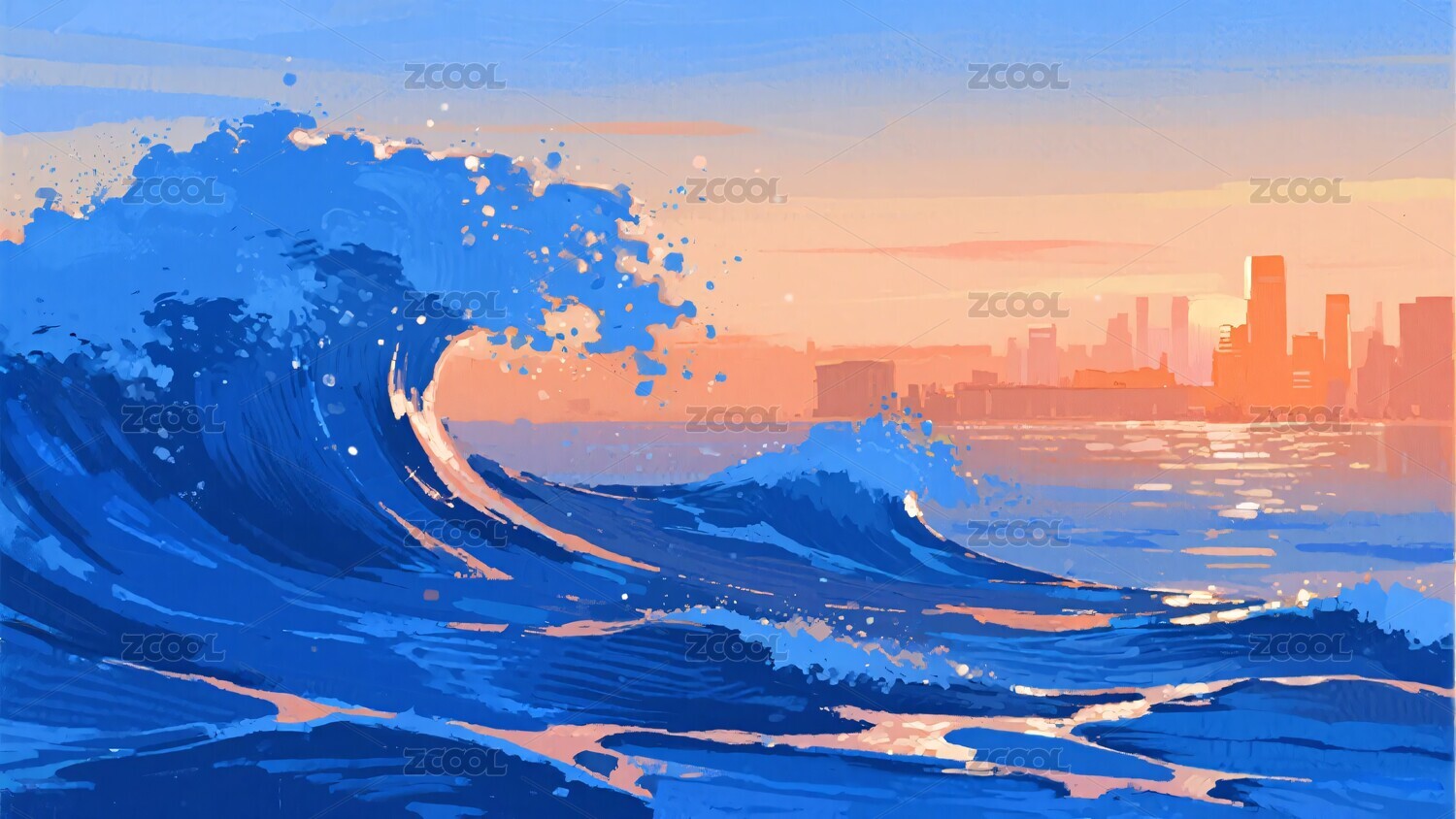 海浪,城市,天际线,插画,风景,梦幻,天空,云朵,色彩,自然