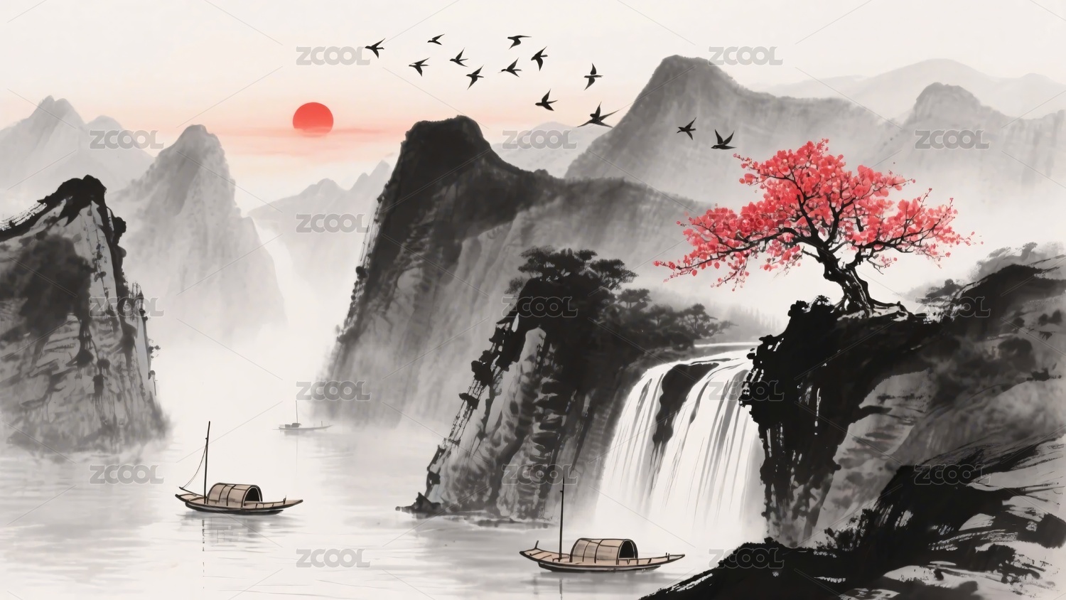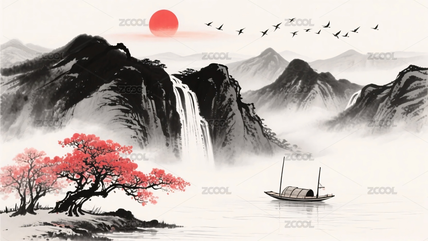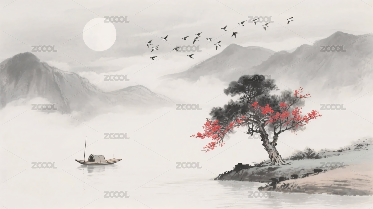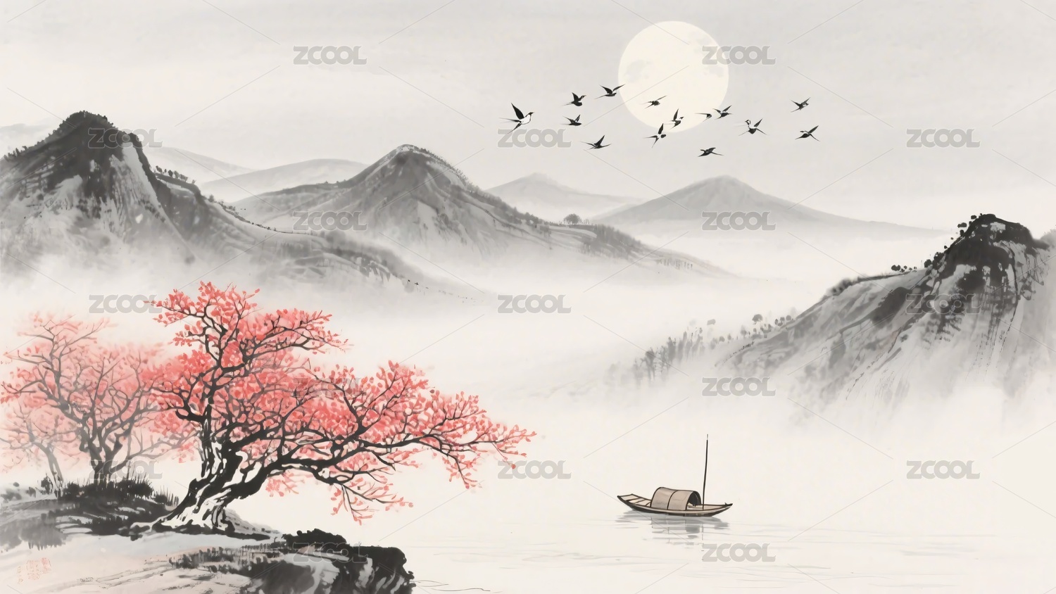 山水,月亮,飞鸟,小船,树木,插画,古风,意境,水墨画,自然