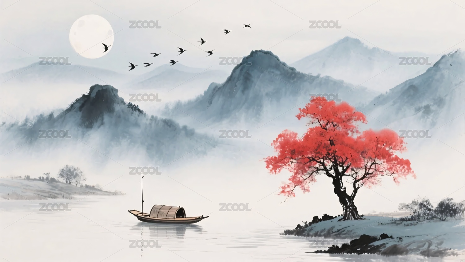 山水,月亮,飞鸟,小船,水墨画,插画,中式,意境,风景,自然