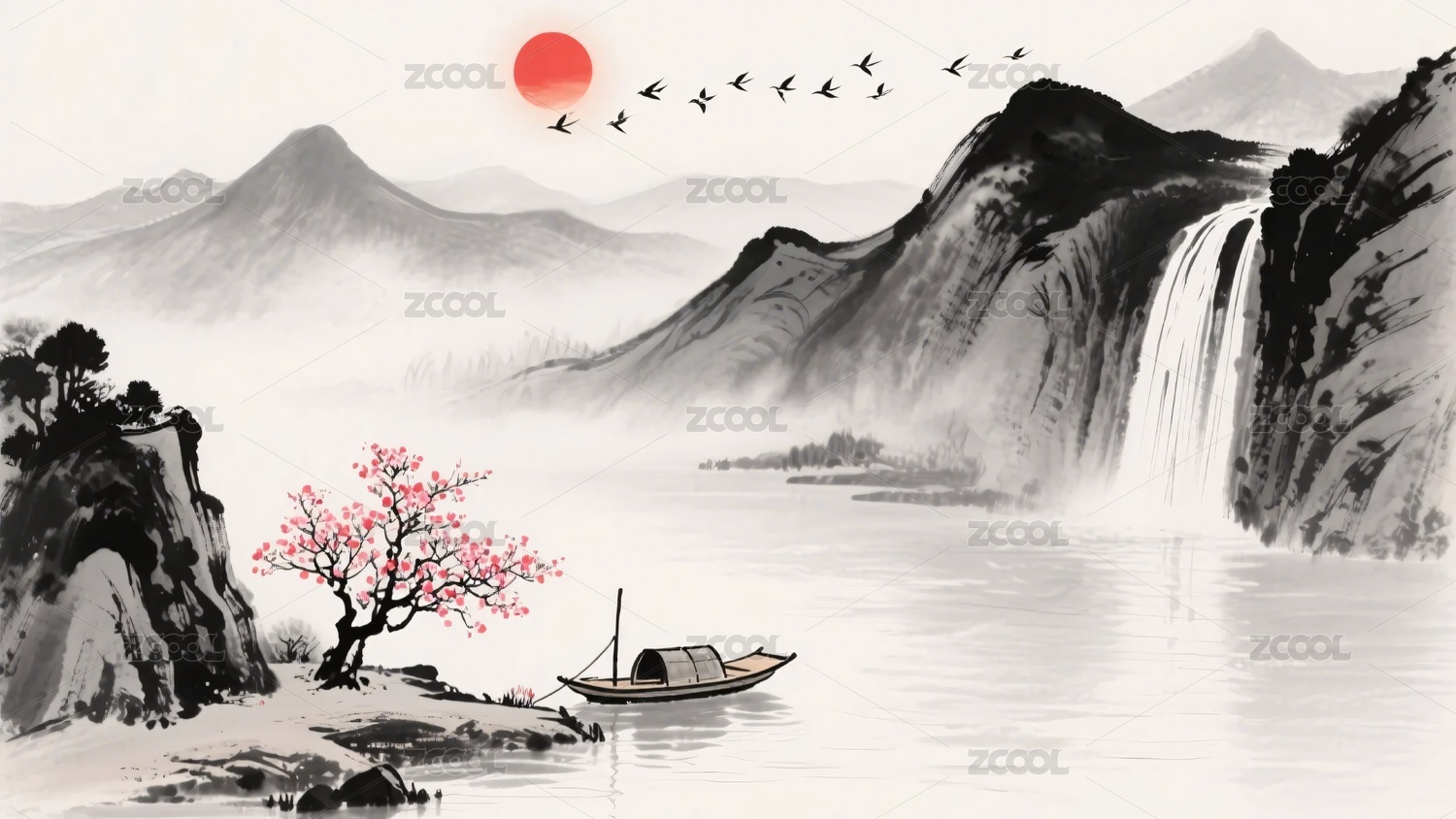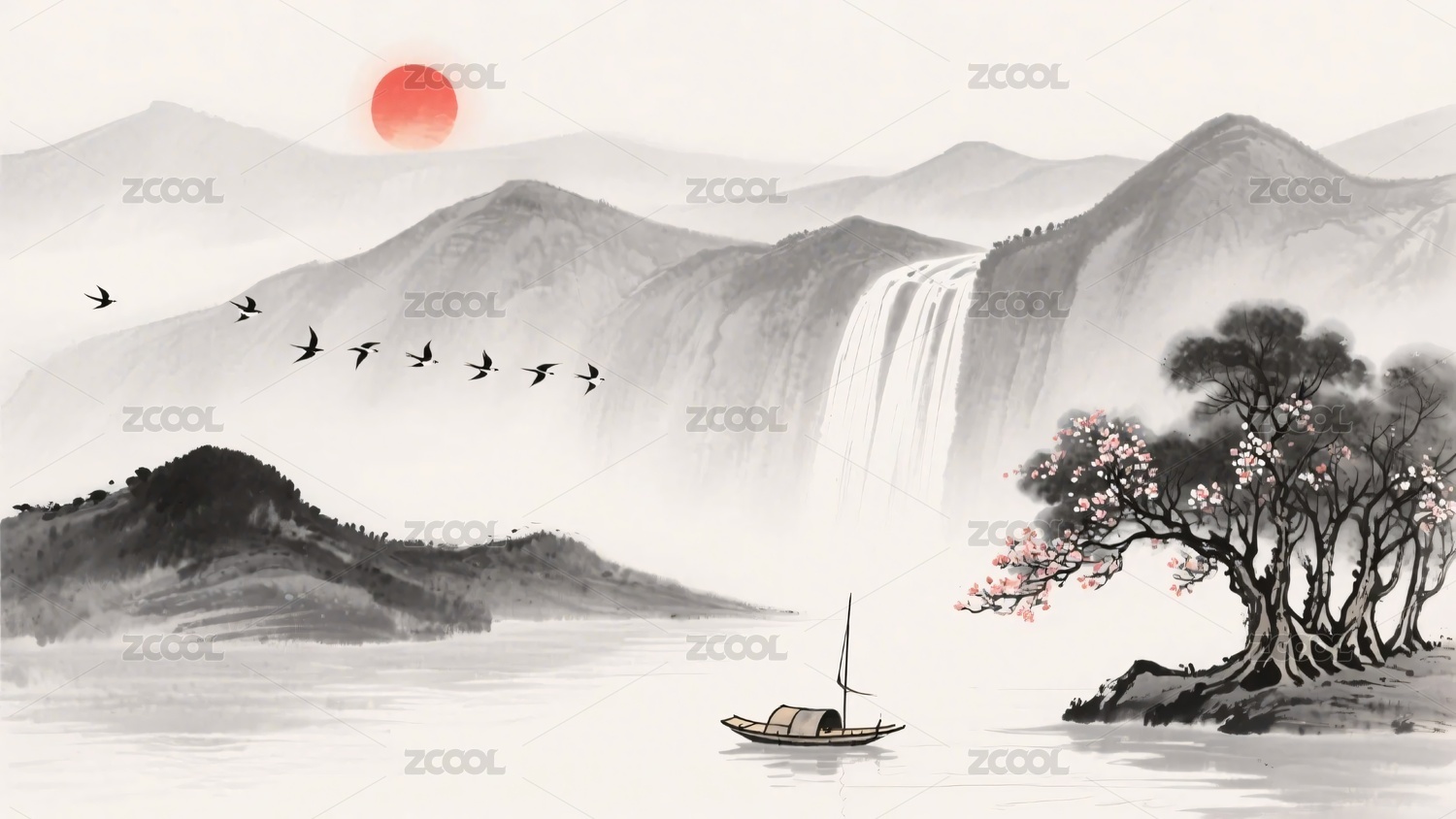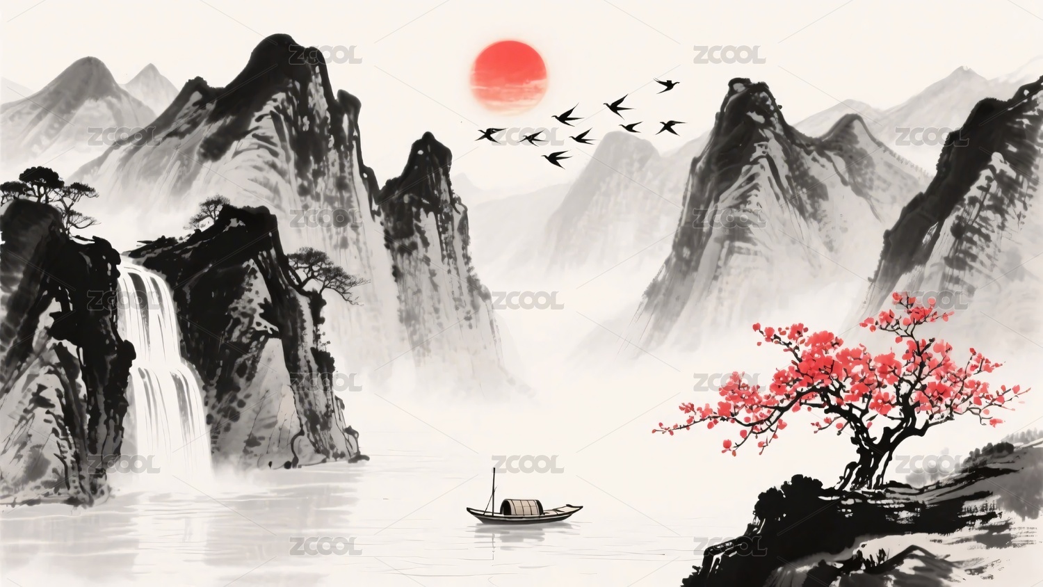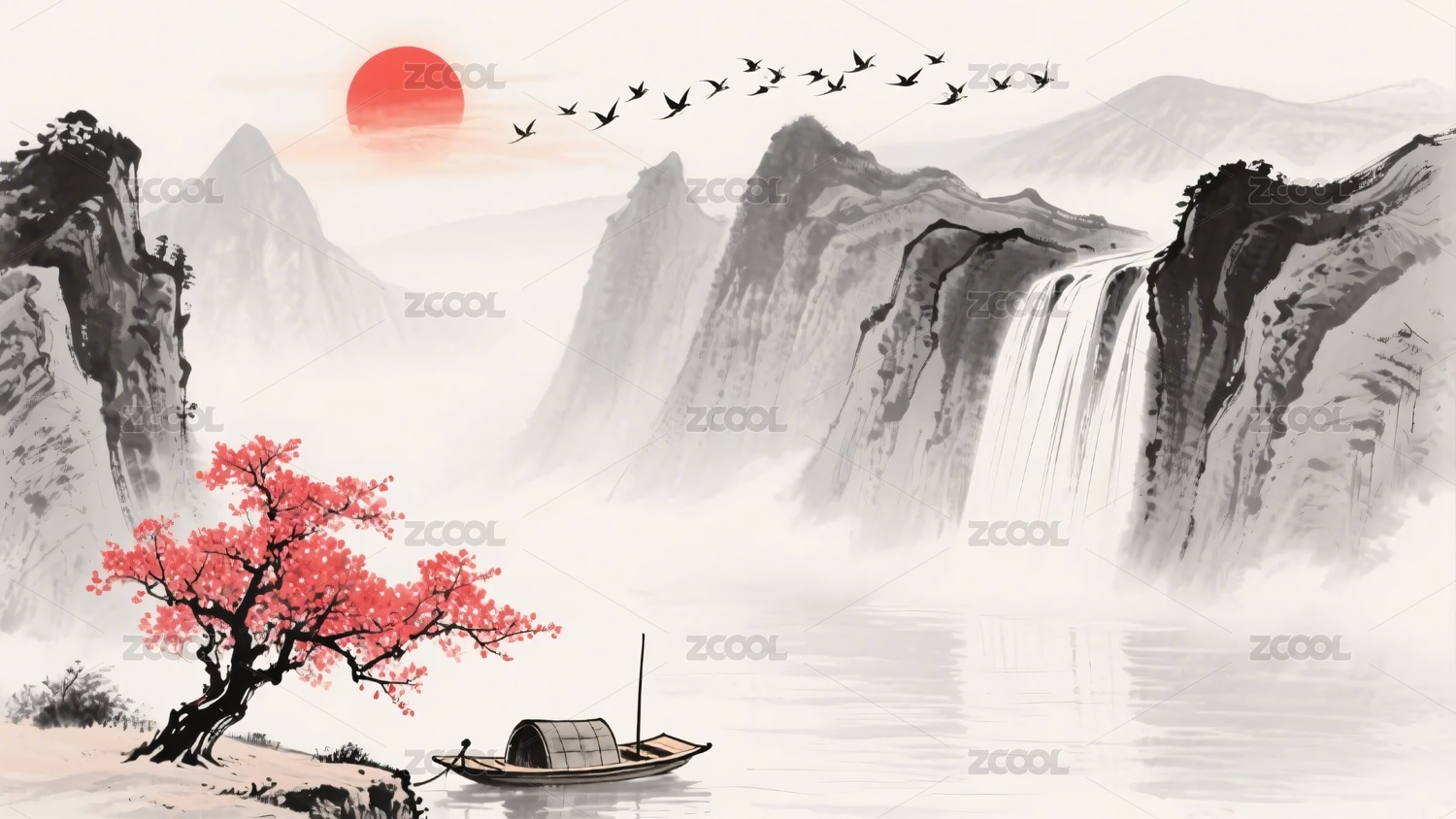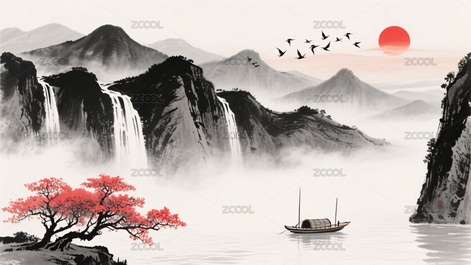 山水,红日,飞鸟,船只,瀑布,红树,插画,国风,意境,自然